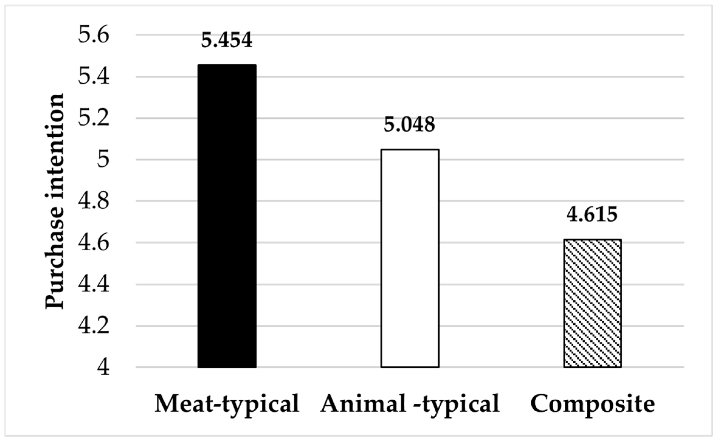 When advertisements depict animals in their typical form, they explicitly remind consumers that meat products originate from the body parts of living animals [27,28]. This reminder evokes the “meat paradox,” wherein people enjoy eating meat but simultaneously reject harming sentient animals [2,29]. When advertisements feature animal-typical imagery, consumers find it more difficult to suppress moral concerns about animal welfare, thereby decreasing their purchase intentions. Moreover, prior research has shown that unprocessed meat is more likely to elicit empathy toward animal slaughter than processed meat, further reducing consumers’ willingness to eat meat [3]. Consequently, animal-typical advertising images are more likely to heighten consumers’ awareness of animal suffering associated with meat consumption, thereby diminishing purchase intention.