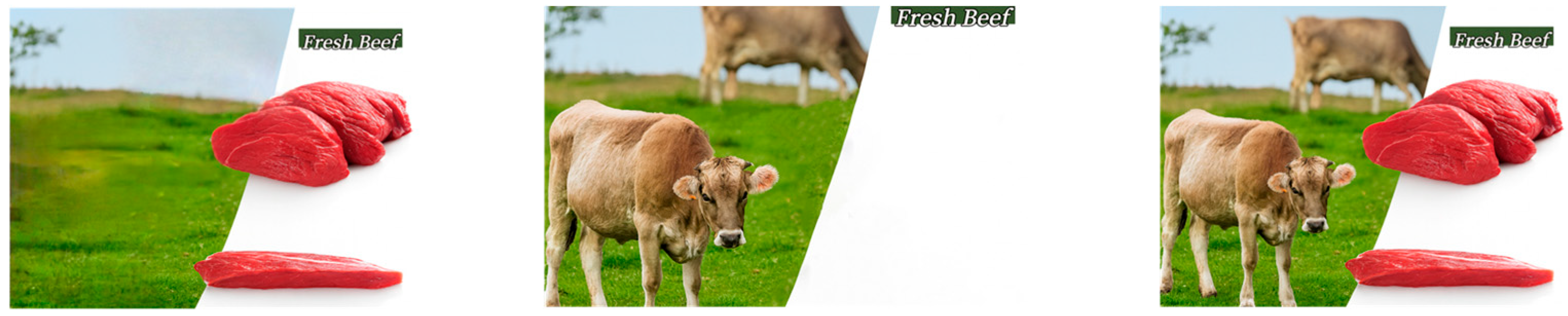 In marketing practice, advertising images of fresh agricultural products generally appear in three forms. For example, the packaging of pork products by Chinese enterprises such as CP Foods and Shuanghui can be broadly categorized into three types: advertising images that display only pork slices, those that display only the pig itself, and composite images that simultaneously display both pork slices and the pig. Kubberød et al. classified animal characteristics into meat typicality, animal typicality, and personification [13]. Meat typicality refers to red meat associated with blood, where blood itself represents a highly stimulating visual cue [20]. Animal typicality refers to meat or meat products that have not been deeply processed and remain strongly connected to the animal body, thereby not concealing their animal nature; for instance, animal organs are closely linked to live animals and often evoke associations with them [13,21,22]. Personification refers to animal images that are emotionally closer to humans, such as pets. Drawing on Kubberød et al.’s classification of animality, this study further categorizes advertising images of fresh agricultural products into three types: meat-typical images displaying only red meat slices, animal-typical images displaying only animal figures, and composite images simultaneously presenting red meat slices and animal figures.