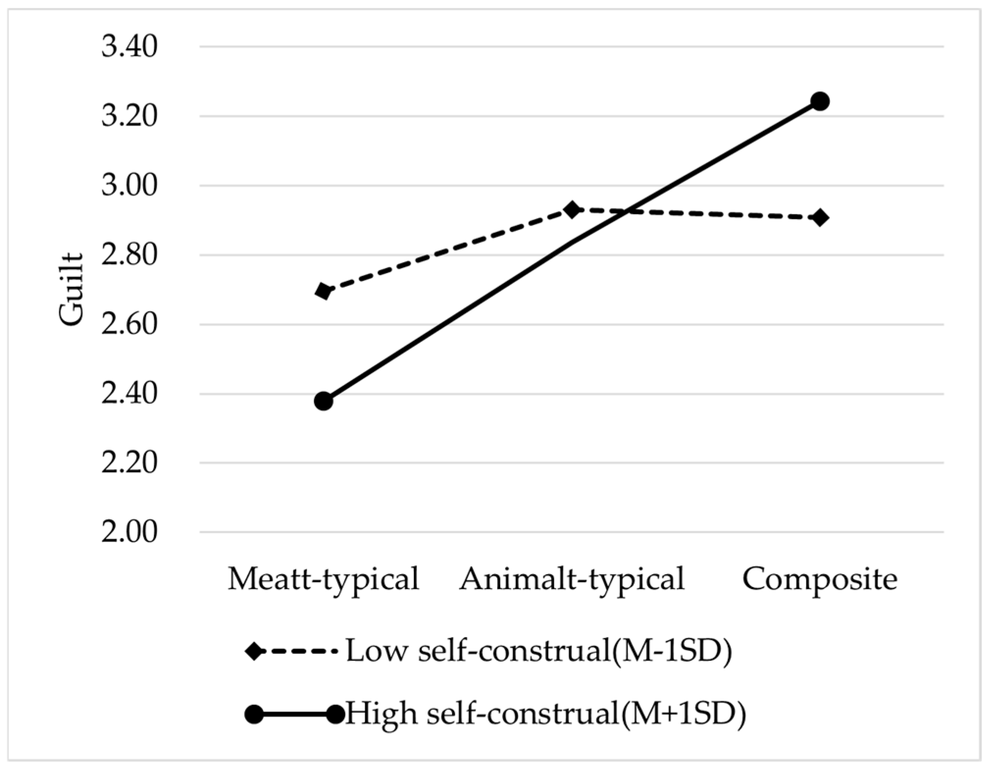 Existing research indicates that the experience of guilt depends not only on individuals’ self-evaluation of their behavior but also on their social–cognitive orientation. According to self-construal theory, differences in self-construal influence individuals’ sensitivity to social norms and situational cues [43]. Individuals with interdependent self-construals place greater emphasis on social relationships and others’ evaluations, tending to assess their behavior through the lens of social and moral norms. Consequently, they are more likely to experience social emotions such as guilt when their actions violate social expectations [44,45]. In contrast, individuals with independent self-construals emphasize personal agency and autonomy and exhibit lower sensitivity to social and moral emotions. In the context of meat advertising, composite images emphasize the connection between animals and food. Interdependent individuals are more likely to recognize that eating meat implies harming animals, thereby eliciting stronger guilt. Conversely, independent individuals tend to focus on product attributes and are less susceptible to moral cues.