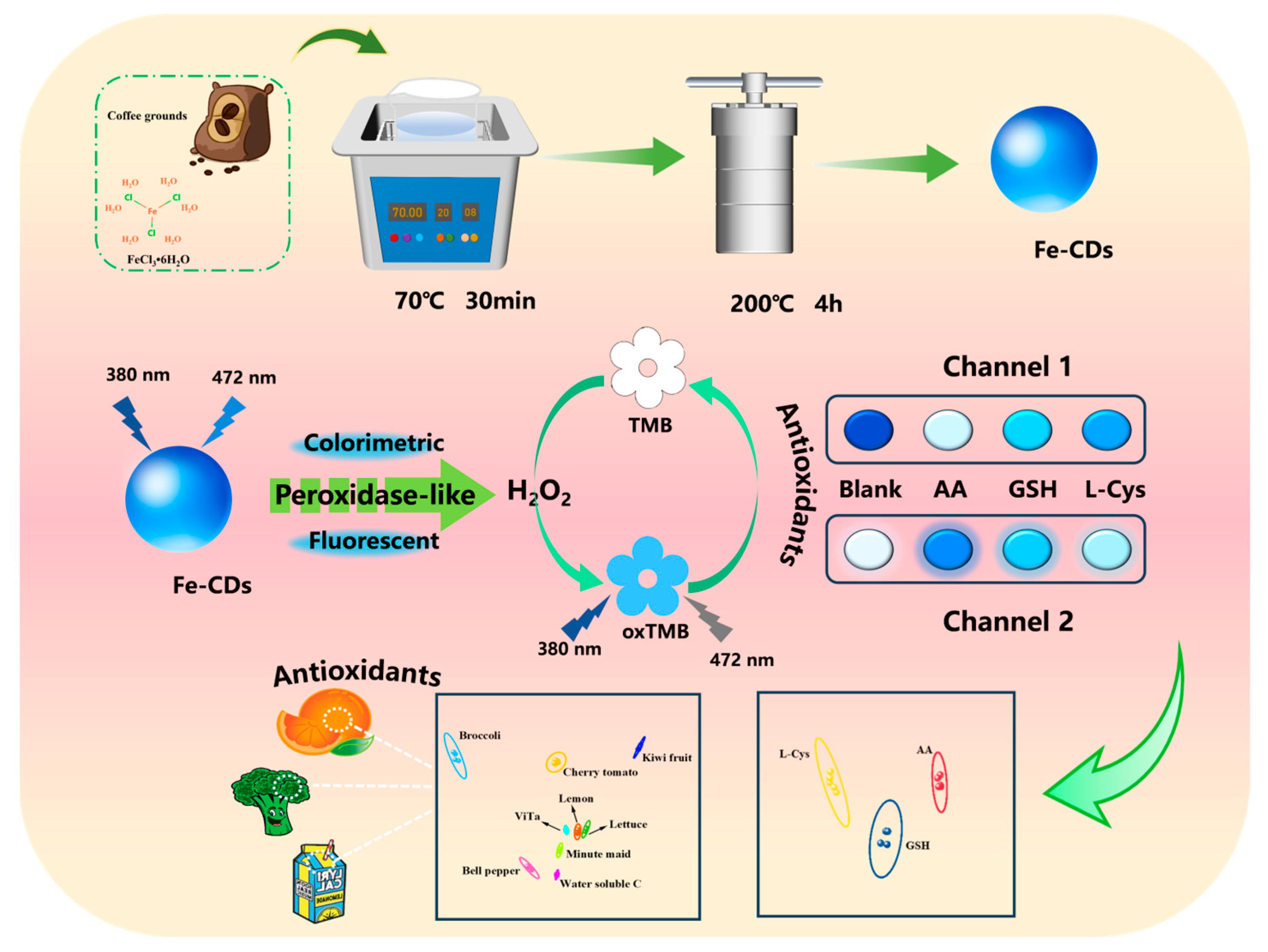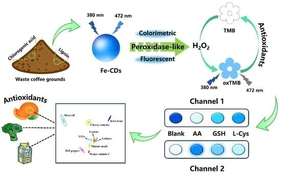 This study successfully synthesized Fe-CDs with outstanding peroxidase-like activity using a low-cost, economical hot-water method, employing waste coffee grounds as a green precursor. The resulting Fe-CDs exhibit satisfactory fluorescence quantum yields, outperforming most reported biomass-derived carbon dots. Iron doping in Fe2+/Fe3+ forms within the carbon matrix creates critical Fe–O active sites, endowing Fe-CDs with high substrate affinity. This material catalyzes the conversion of H2O2 into reactive oxygen species such as •OH and 1O2. A dual-channel colorimetric/fluorescence sensor array constructed based on this material enables precise identification and detection of AA, GSH, L-Cys, and their mixtures. The sensor demonstrates excellent performance in real samples (vegetables, fruits, beverages). This study not only achieves high-value utilization of waste coffee grounds but also provides an innovative and economical solution for rapid, reliable detection of total antioxidant capacity in food through a single-material, dual-channel sensing strategy.