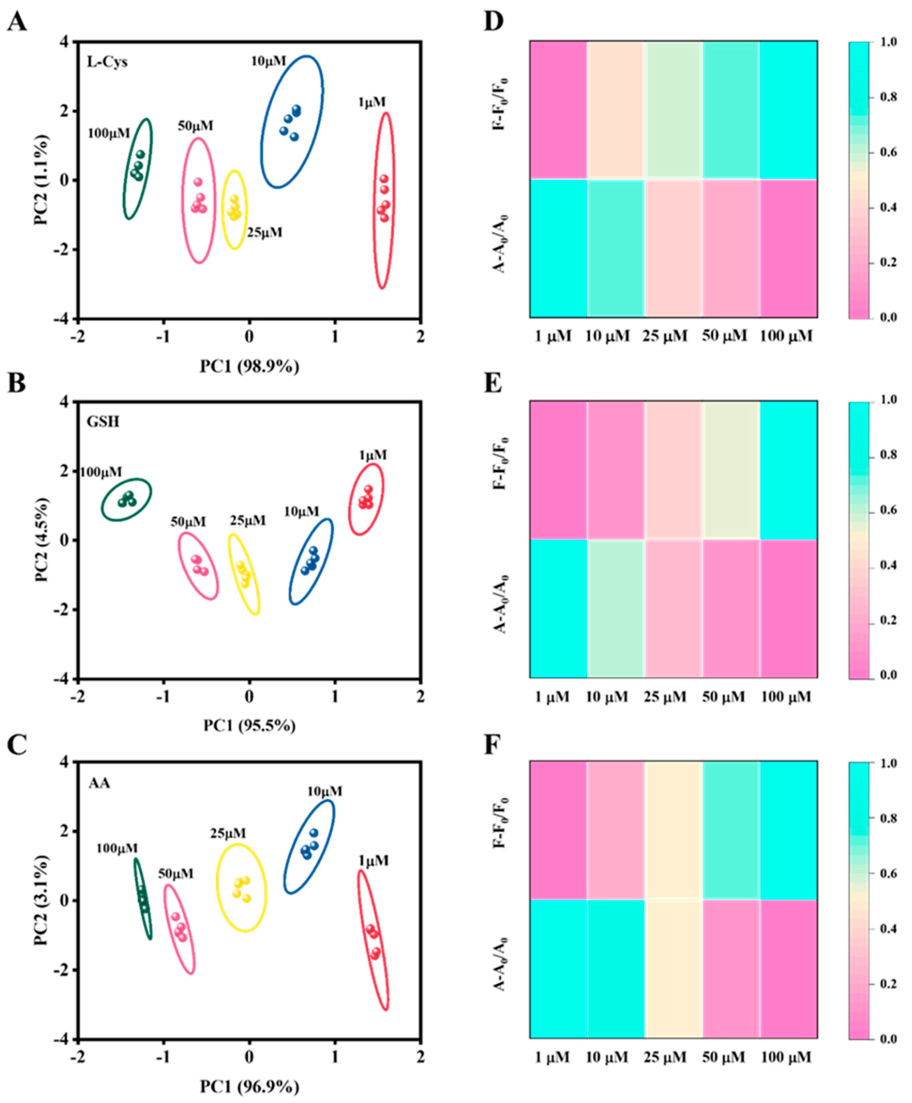 Figure 3. PCA plots of the sensor array corresponding to different concentrations of antioxidants. PCA plots for varying concentrations of (A) L-Cys, (B) GSH, and (C) AA. Heatmaps corresponding to different concentrations of (D) L-Cys, (E) GSH, and (F) AA.