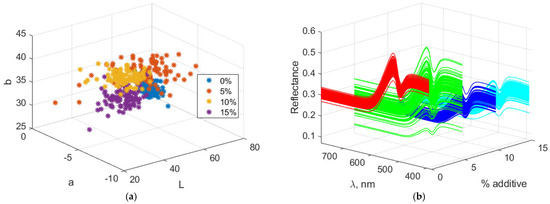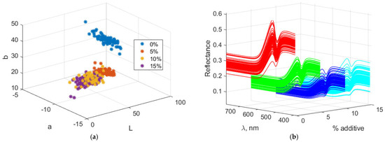 Figure 3 presents the Lab and spectral characteristics of biscuit dough containing amaranth. Lab values and spectral data generally change according to the color properties of the additive as its proportion in the dough increases. With higher additive levels, the âLâ value decreases, indicating that the dough becomes darker. The âaâ and âbâ values adjust according to the hue of the additive: âaâ decreases because the additive lacks a reddish tint, while âbâ increases due to the additiveâs greenish-yellow hue. The resulting spectral data reflect the loss of lightness, accompanied by wavelength shifts corresponding to the reflectance characteristics.