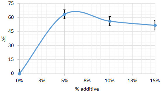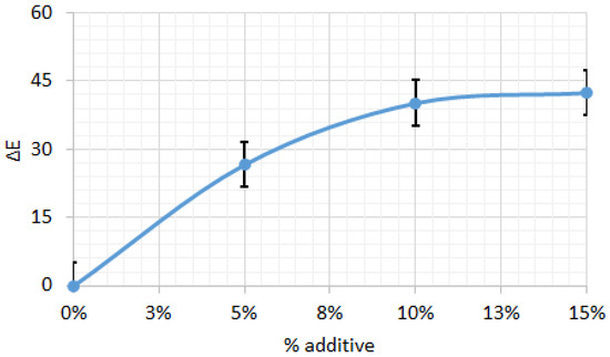 Color difference for biscuit dough between control sample and those with different percentages of additive. All data have statistically significant difference at p < 0.05.