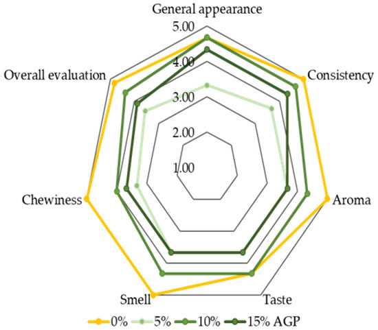 Statistically significant differences were registered between the different flourâAGP mixtures (from 0% to 15%). (Table 5) The increase in the AGP content caused a slight decrease in the pH value (from 6.55 to 6.28); hence, the acidity of the mixture slightly raised.