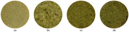 Color images of biscuit doughs with additive. (a) 0% additive; (b) 5% additive; (c) 10% additive; (d) 15% additive.