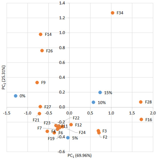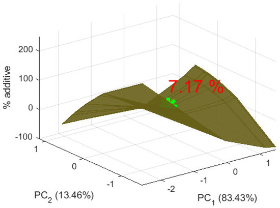 Possible combinations between % additive and different informative features are given in Table 3. Such analysis was performed for all cases of added green amaranth powder (from 0 to 15%), and only the selected informative features were used.