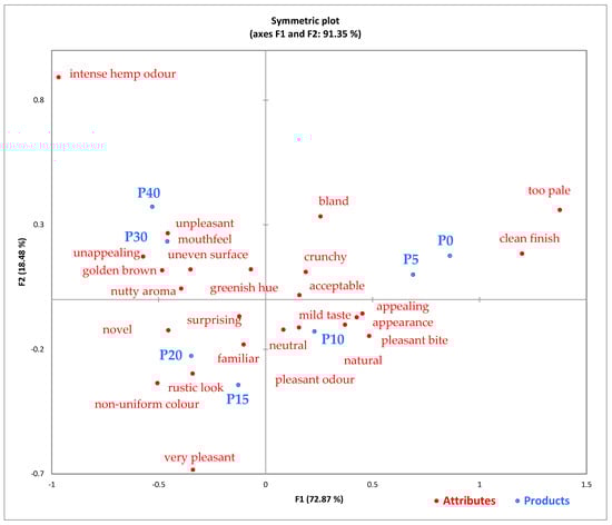 Correspondence Analysis (CA) biplot of pretzel samples and CATA attributes. P0—control sample, P5—pretzel with 5% addition of hempseed cake, P10—pretzel with 10% addition of hempseed cake, P15—pretzel with 15% addition of hempseed cake, P20—pretzel with 20% addition of hempseed cake, P30—pretzel with 30% addition of hempseed cake, P40—pretzel with 40% addition of hempseed cake.