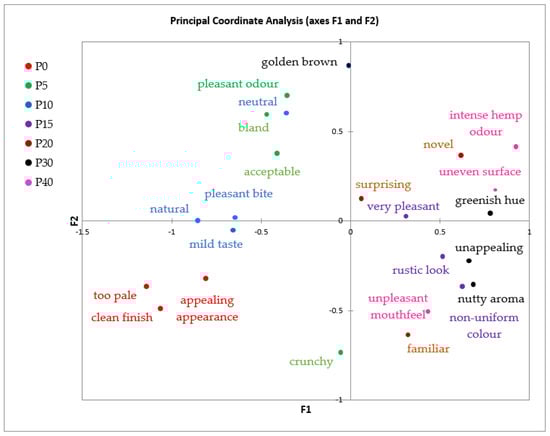 Principal Coordinate Analysis (PCoA) of sensory attributes derived from CATA data. P0—control sample, P5—pretzel with 5% addition of hempseed cake, P10—pretzel with 10% addition of hempseed cake, P15—pretzel with 15% addition of hempseed cake, P20—pretzel with 20% addition of hempseed cake, P30—pretzel with 30% addition of hempseed cake, P40—pretzel with 40% addition of hempseed cake.