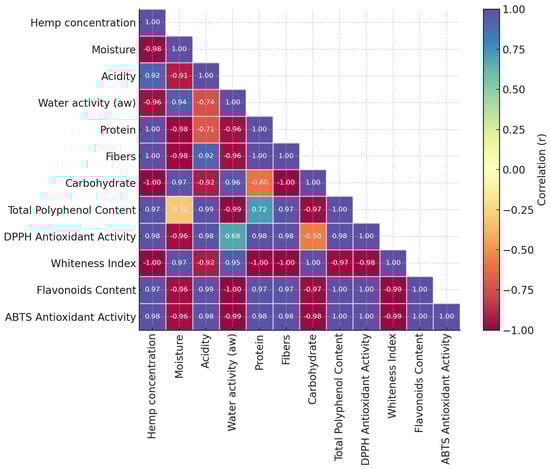 Pearson correlation analysis was conducted to elucidate the interrelationships among key technological, nutritional, and functional parameters of hemp-fortified pretzels. This multivariate statistical approach facilitated the identification of significant positive or negative associations between variables such as hemp seed cake concentration, moisture, protein, acidity, water activity, fiber, carbohydrate total polyphenol content, antioxidant activity, and whiteness index. The resulting correlation matrix was visualized as a heatmap (Figure 3), offering mechanistic insights into the patterns observed across the experimental formulations [39].