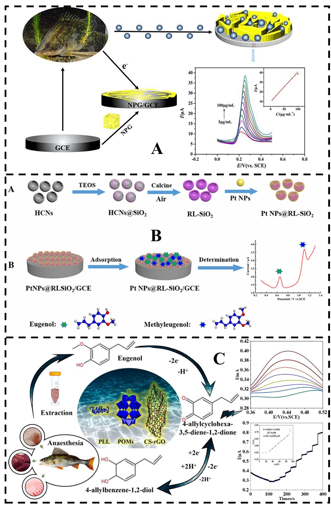 | LC | AQUI-S® 20E (eugenol) | standard water containing fish feed | SPE | 5–500mg L−1 | RSD < 0.7%, n = 3 | 0.0011 mg L−1 | [115] |