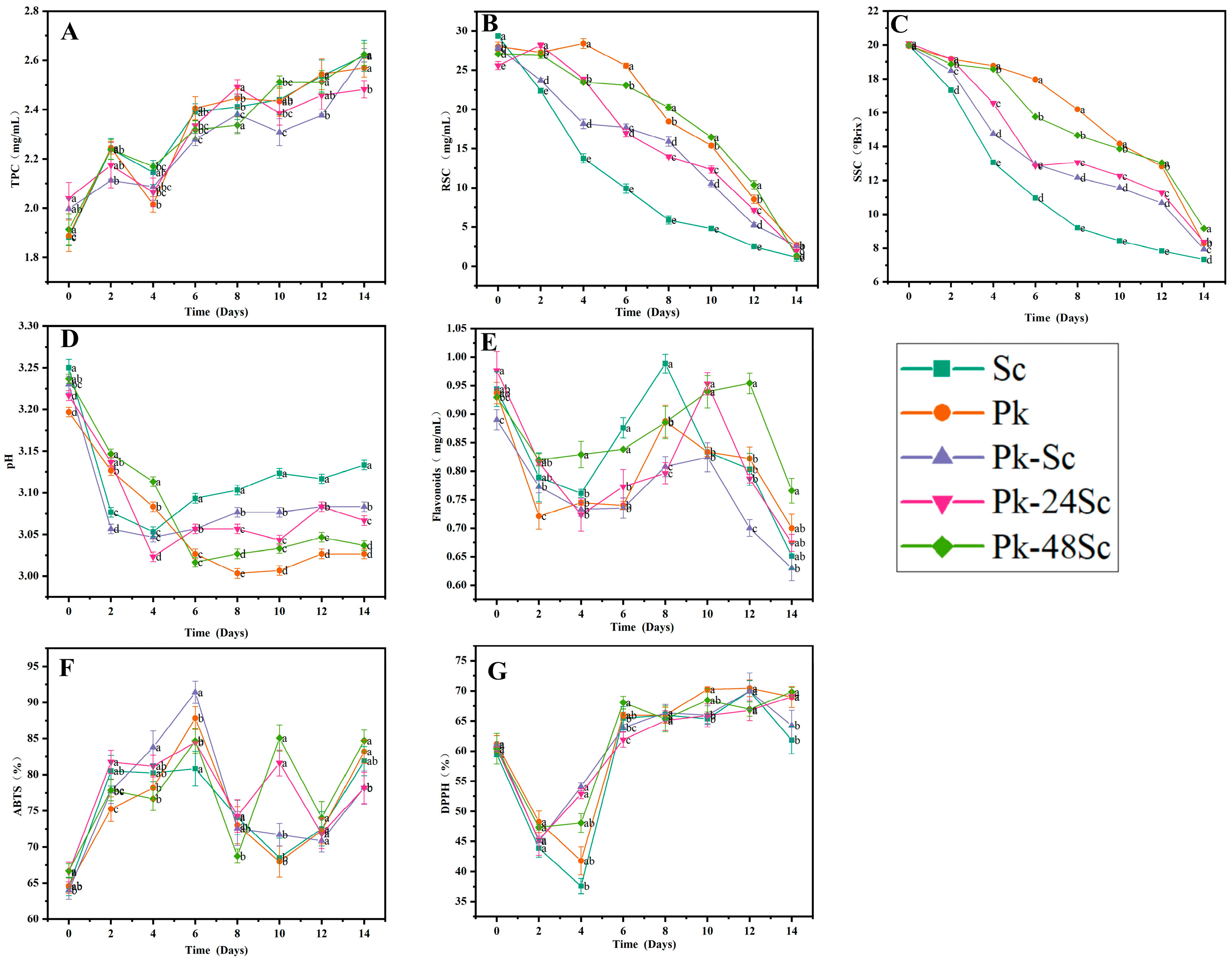 | TPC (mg/mL) | 2.63 ± 0.07 b | 2.59 ± 0.03 b | 2.58 ± 0.06 b | 2.62 ± 0.04 b | 2.83 ± 0.04 a |