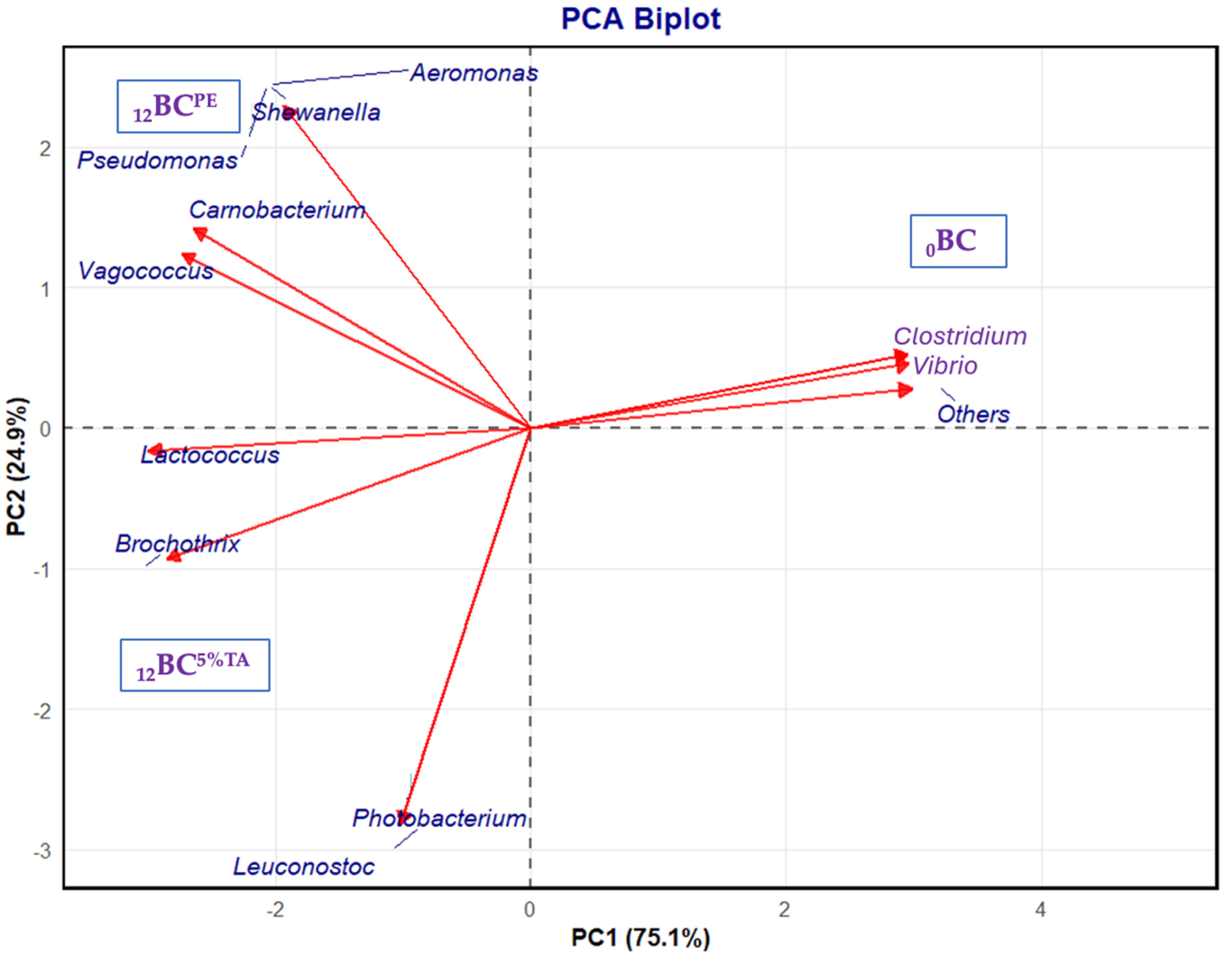 Figure 7. Principal component analysis (PCA diagram) of taxonomic groups at the genus level in baby clam edible portions packaged in pouches made of bilayer films based on chitosan/fish gelatin loaded without and with 5% tannic acid deposited on polylactic acid film before and after refrigerated storage for 12 days. BC: fresh, PE: Polyethylene and TA: tannic acid. Low-abundance species (<1%) and unassigned taxa were grouped under “Others”.