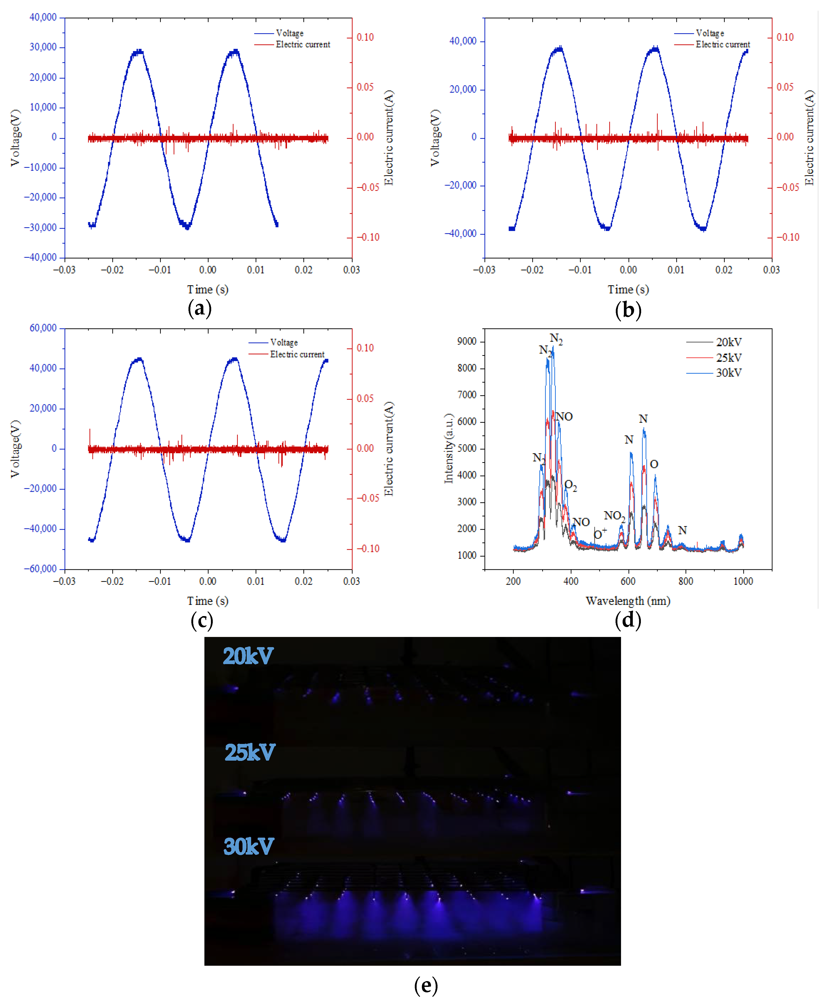 Figure 3e, it can be seen that as the input voltage increases, the discharge area gradually expands. It can be clearly observed from the figure that a blue-purple glow is produced during the discharge process. At lower voltages, only a weak light can be observed, while at 30 kV, the blue-purple light is the strongest, indicating that the discharge phenomenon becomes more significant as the voltage increases. At the same time, the uniformity and area of the discharge between the electrodes also gradually expand as the voltage increases.