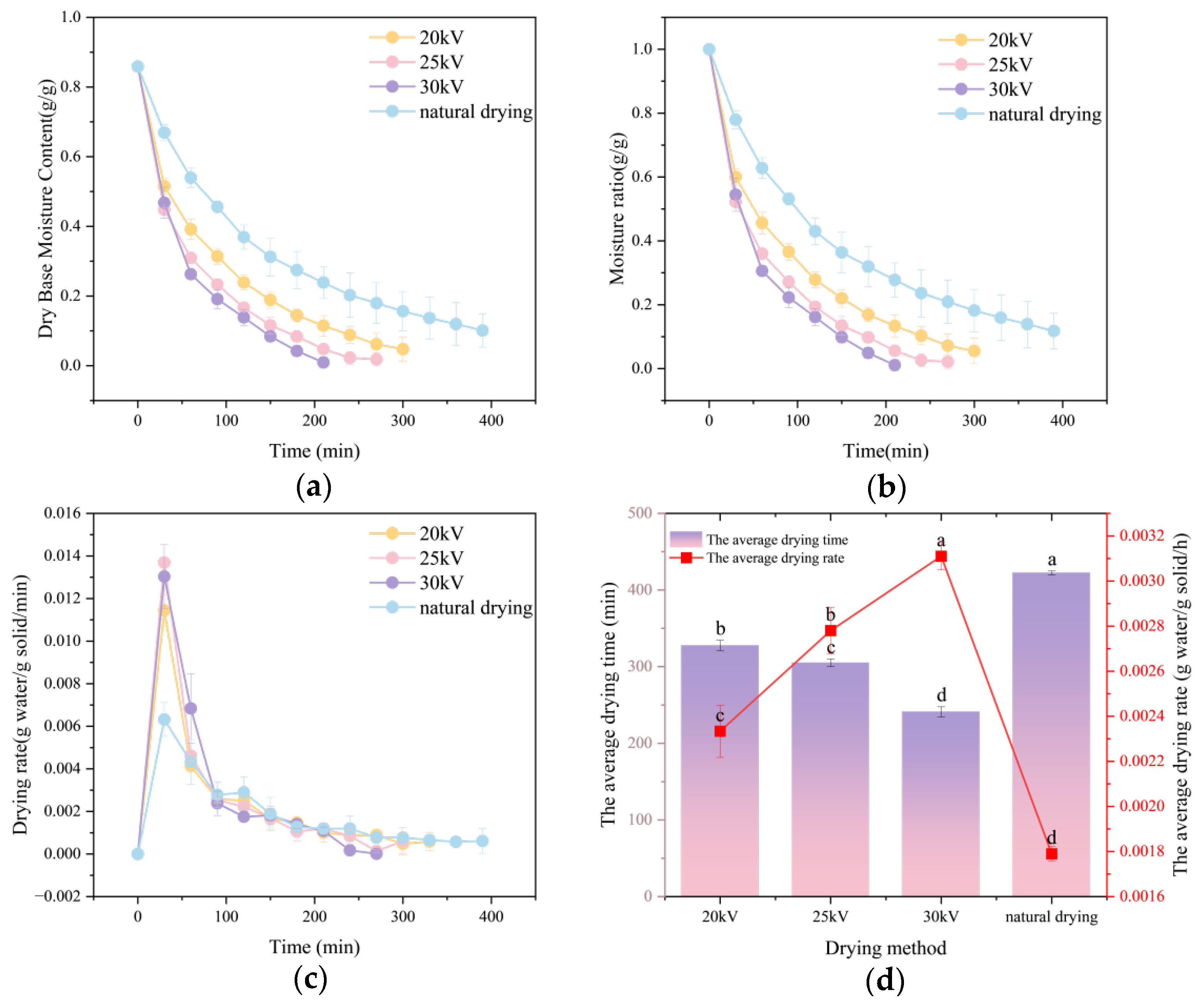 Figure 4d demonstrates that EHD significantly reduced drying time; with an increase in the drying voltage, the drying time of Astragalus membranaceus slices is remarkably shortened (