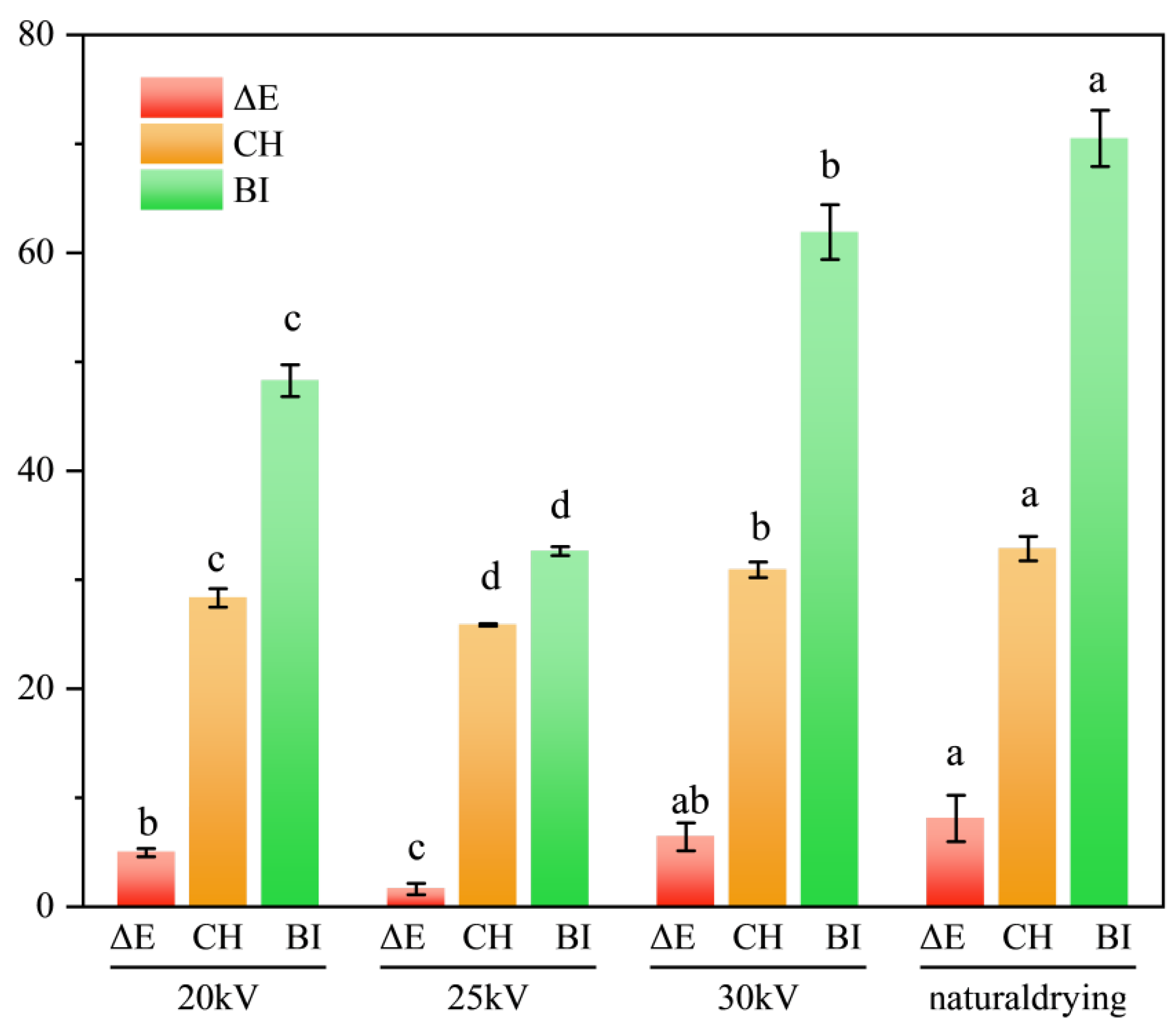 p < 0.05) and reached the minimum value at 25 kV. The smaller the ΔE, the closer the color of the dried sample is to that of the fresh sample. The ΔE of the 25 kV EHD treatment group was only 0.13 times that of the ND treatment group.