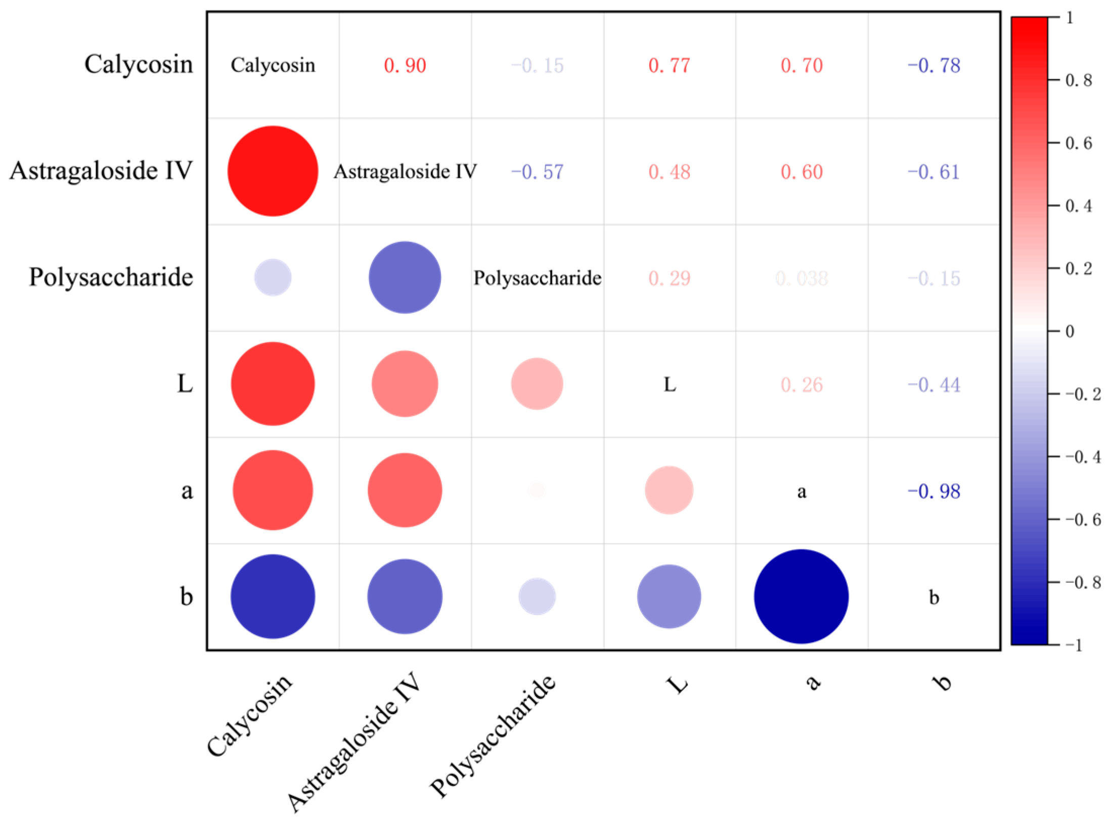 Figure 10, according to the correlation heatmap analysis, calycosin is the main driver of color changes, while astragaloside IV plays a secondary leading role. The L value and a value are positively correlated with the content of calycosin and astragaloside IV, while the b value is negatively correlated.