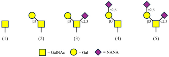 GMP’s five glycan structures composed of N-acetylgalactosamine (GalNAc), galactose (Gal), and N-acetylneuraminic acid (NANA).