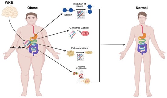 White kidney beans (Phaseolus vulgaris L.) are native to the Mesoamerican and Andean regions [16]. They are abundant in complex carbohydrates, protein and bioactive compounds that promote metabolic health [3]. White kidney beans, which are rich in potassium (K) and magnesium (Mg), have been reported to confer benefits in individuals with conditions, such as atherosclerosis and hyperlipidemia [17]. Phaseolamin, a naturally occurring α-amylase inhibitor found in beans, impedes starch hydrolysis and retards carbohydrate digestion [18,19]. This process reduces caloric absorption, lowers the glycemic index of meals, and facilitates blood glucose regulation [20,21,22]. WKBE also enhances metabolic equilibrium and beneficially modulates the gut microbiota [23,24]. Furthermore, it mitigates fat accumulation and hyperglycemia while promoting weight loss [25]. A recent study indicates that α-amylase inhibitors derived from white kidney beans exhibit no adverse effects on the human body and can serve as safe dietary agents [26]. It also effectively regulates energy intake and appetite, thereby demonstrating promising outcomes in clinical studies involving obese patients, as illustrated in Figure 1 [27]. Although numerous studies have documented the nutritional properties and therapeutic importance of white kidney beans (Phaseolus vulgaris), a comprehensive synthesis of their impact on weight management remains scarce.