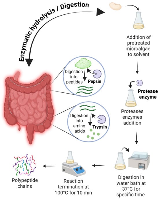 Protein fractions from white kidney beans are typically modified via enzymatic and chemical hydrolysis to augment their bioactive and functional properties for food and nutraceutical applications [90]. Enzymatic hydrolysis employs common proteases, such as pepsin, papain, alcalase, and flavourzyme as shown in Figure 5. These enzymes cleave peptide bonds, yielding protein hydrolysates that improve foaming, emulsifying, and solubility properties [91,92,93]. For instance, pepsin hydrolysis achieved a degree of hydrolysis (DH) of 8.6% (60 min), thereby enhancing solubility, emulsifying, and foaming properties [94]. Enzymatic hydrolysis generates bioactive peptides exhibiting antioxidant, antimicrobial, and antihypertensive activities. Furthermore, papain- or alcalase-derived hydrolysates display pronounced antioxidant and antibacterial properties and inhibit enzymes associated with diabetes and hypertension [95].