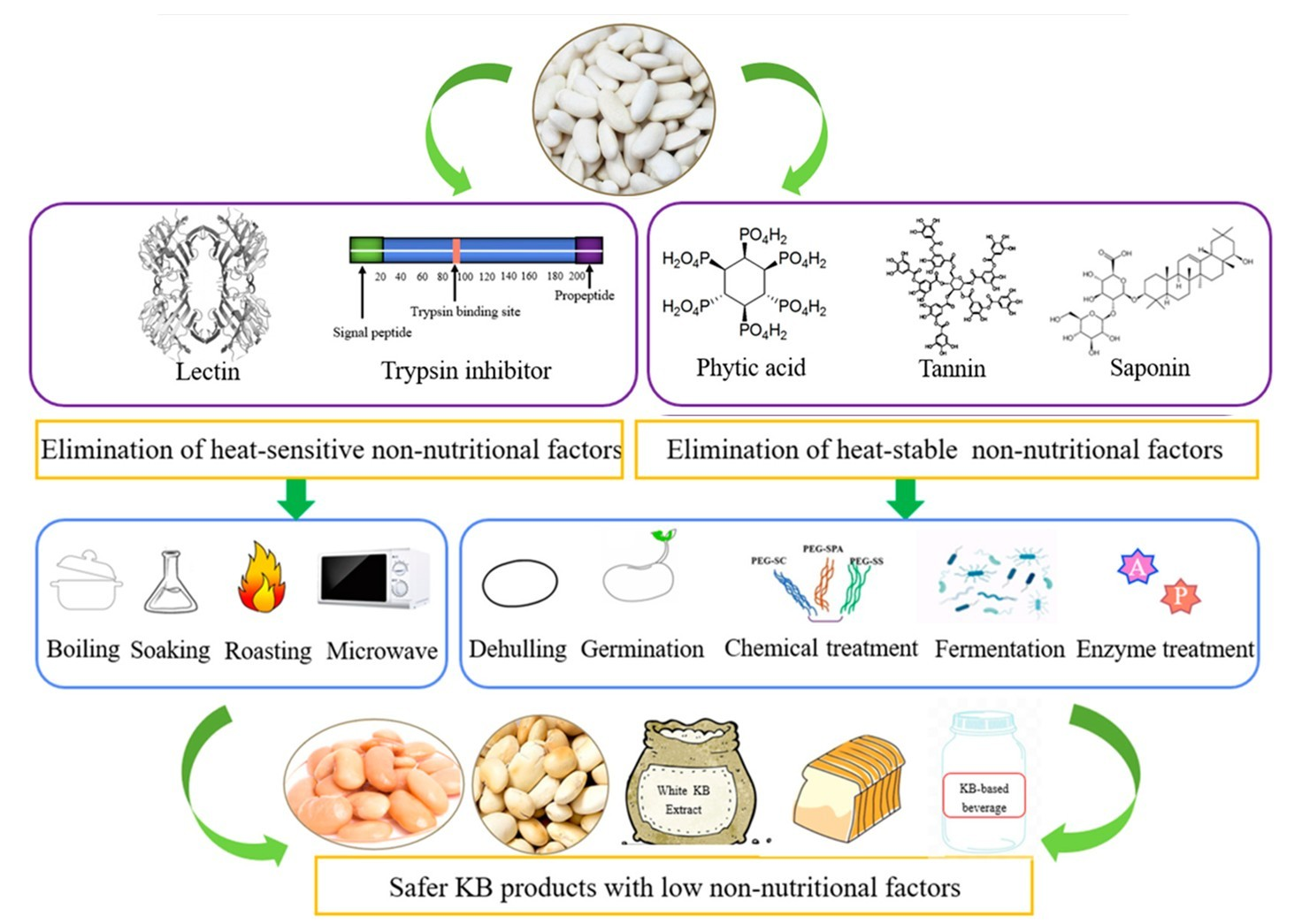 - Zhang, Z.; Liu, C.; Wu, S.; Ma, T. The Non-Nutritional Factor Types, Mechanisms of Action and Passivation Methods in Food Processing of Kidney Bean (Phaseolus vulgaris L.): A Systematic Review. Foods 2023, 12, 3697. [Google Scholar] [CrossRef]