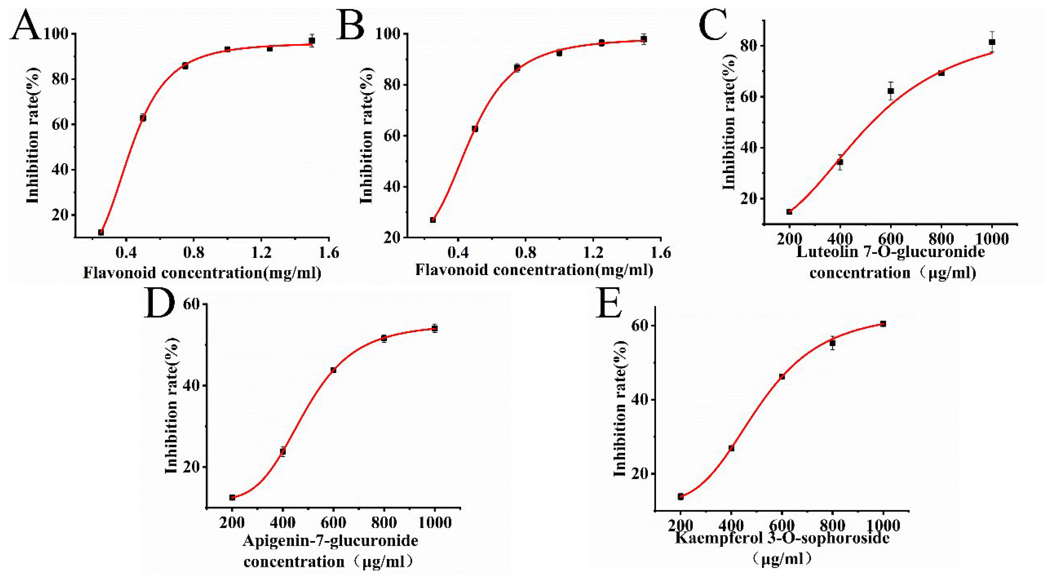 3.7. Inhibition of α-Glucosidase by PFF and Flavonoid Monomer Substances