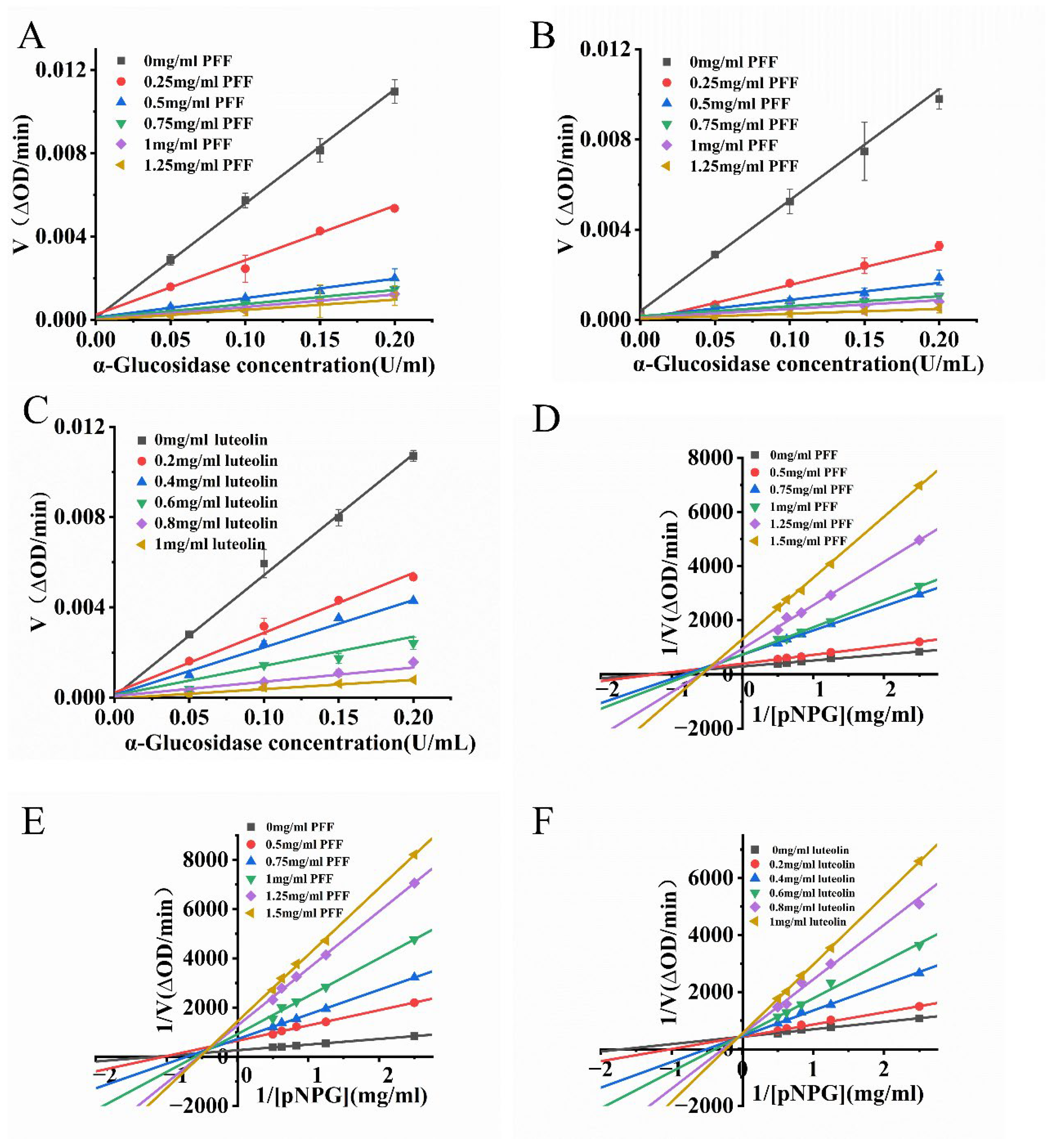 2.10. Type of Inhibition of α-Glucosidase by PFF and Luteolin 7-O-Glucuronide