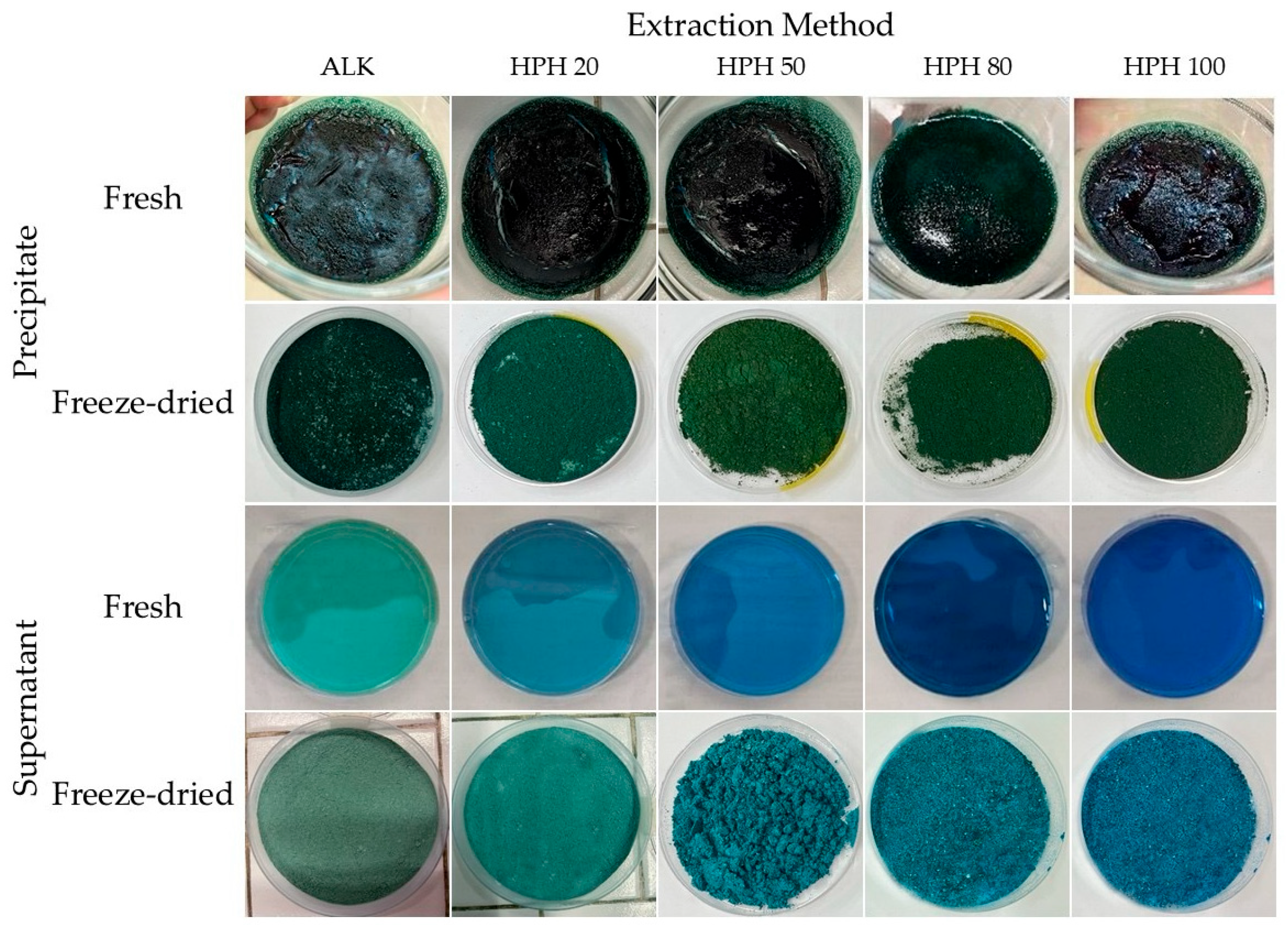 Figure 1. Visual comparison of precipitate and supernatant fractions obtained from Spirulina protein extraction using alkaline and high-pressure homogenization (20–100 MPa) methods, before and after freeze-drying.
