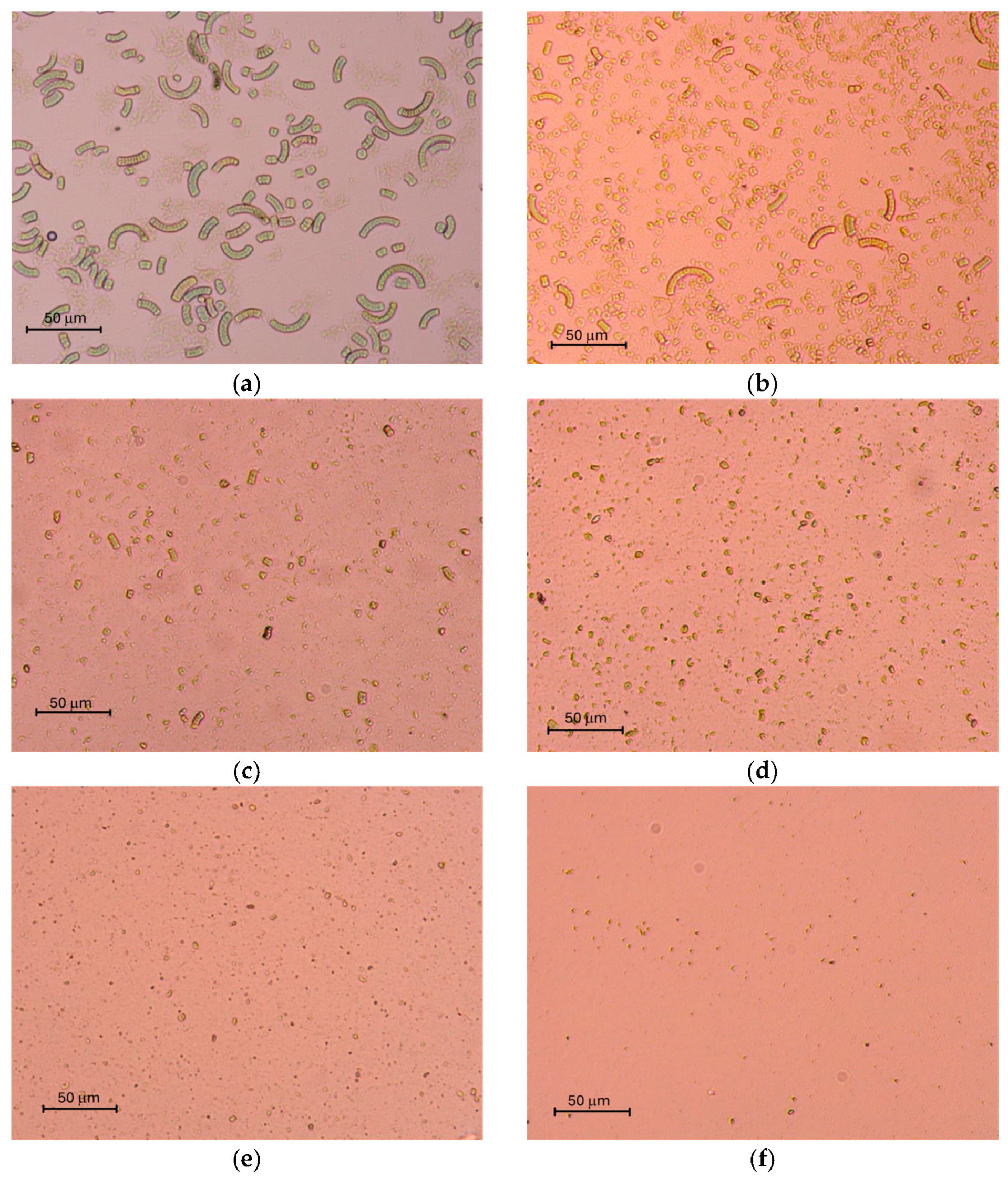 Figure 2. Optical microscopy images (100× magnification) of Spirulina suspensions after different extraction treatments. (a) Untreated SB control; (b) alkaline extraction; (cf); HPH at 20, 50, 80 and 100 MPa, respectively.
