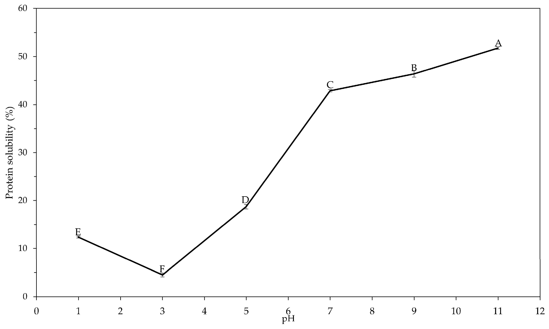Figure 3. Protein solubility (%) of ALK-P at different pH values. Different letters (A–F) indicate statistically significant differences between means (p < 0.05).