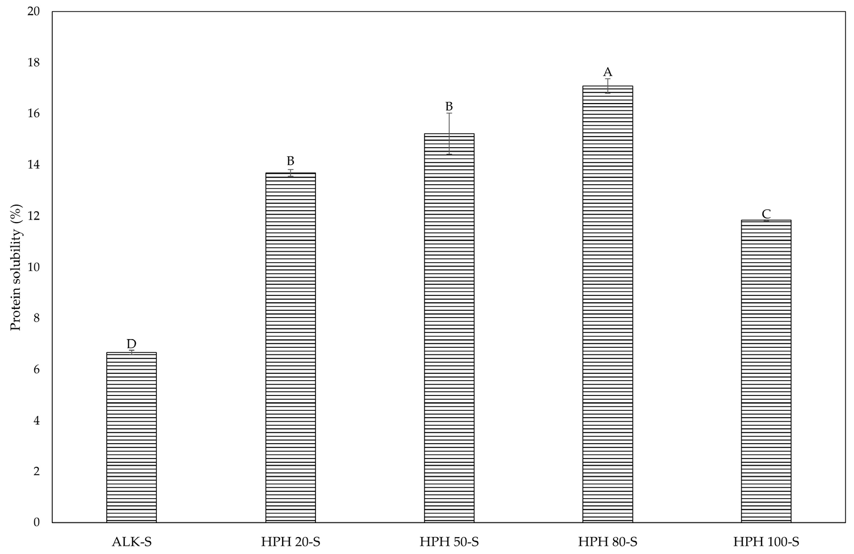 Figure 4. Protein solubility (%) at pH 7 of Spirulina supernatant fractions obtained by alkaline treatment (ALK-S) and HPH at different pressures (20, 50, 80 and 100 MPa). Different letters indicate statistically significant differences among samples (p < 0.05).