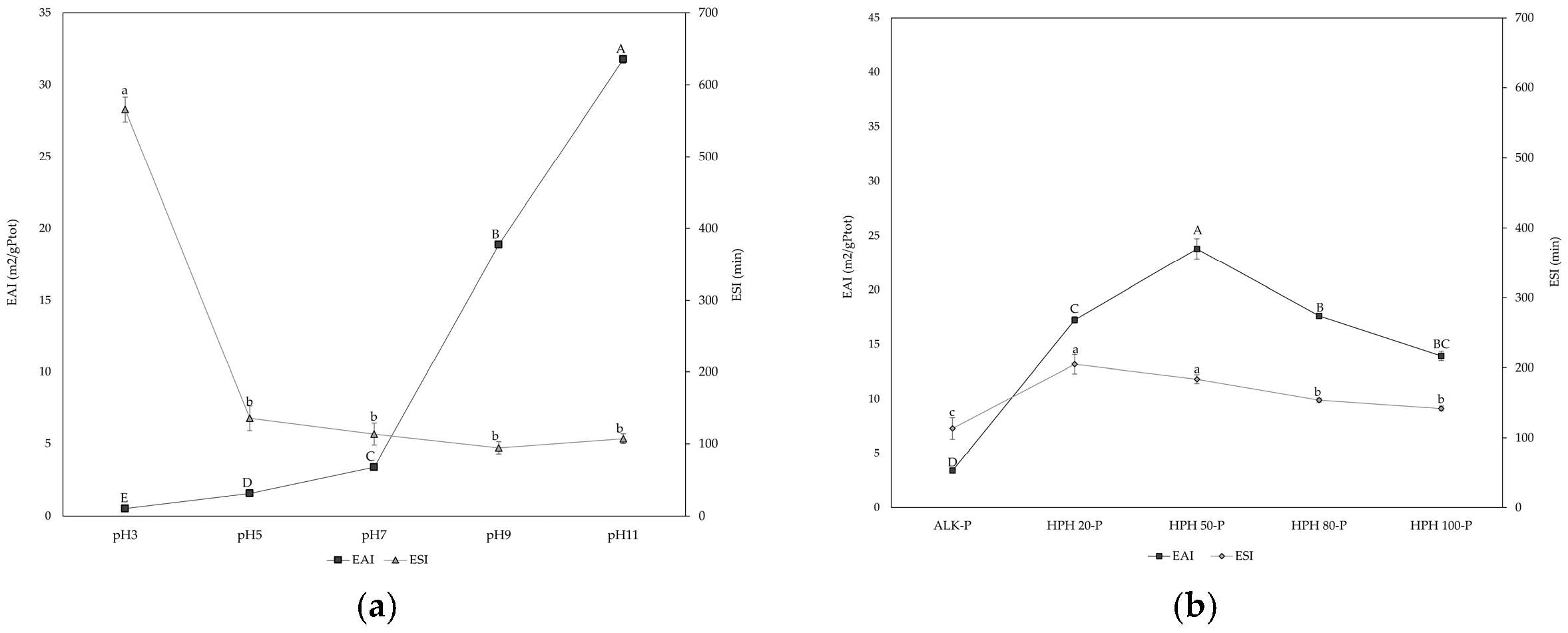 Figure 5. Emulsifying Activity Index (m2/gPtot) and Emulsion Stability Index (min) of protein extracts from Spirulina. (a) Effect of pH (3, 5, 7, 9 and 11) on the emulsifying properties of the ALK-P; (b) Comparison between ALK-P at pH 7 and samples extracted by HPH at 20, 50, 80 and 100 MPa. Different letters indicate statistically significant differences among samples (p < 0.05) for each parameter (EAI: uppercase letters A–E; ESI: lowercase letters a–c).