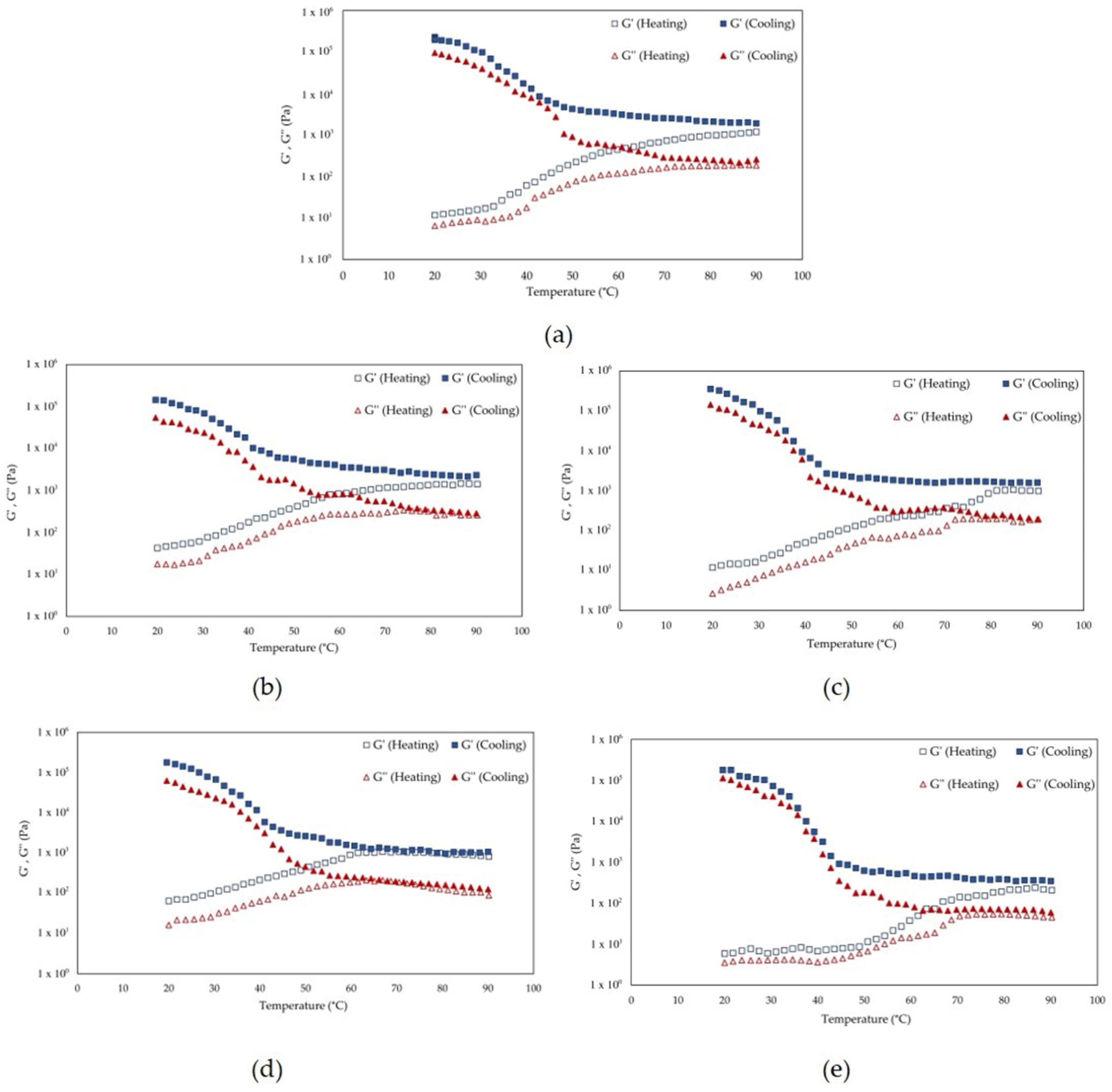 Figure 6. Temperature-dependent viscoelastic moduli G′ (storage modulus) and G″ (loss modulus) of Spirulina protein extracts during heating (solid lines) and cooling (dashed lines) cycles. The samples include (a) ALK-P and those obtained by HPH at (b) 20 MPa, (c) 50 MPa, (d) 80 MPa and (e) 100 MPa.