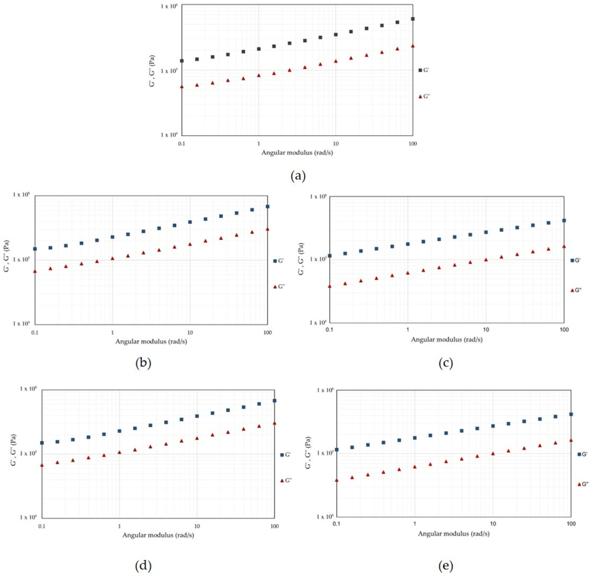 Figure 7. Frequency sweep profiles of Spirulina protein extracts showing the storage modulus (G′, squares) and loss modulus (G″, triangles) as a function of angular frequency (0.1–100 rad/s). Samples were obtained by (a) ALK and by HPH at (b) 20 MPa, (c) 50 MPa, (d) 80 MPa and (e) 100 MPa.