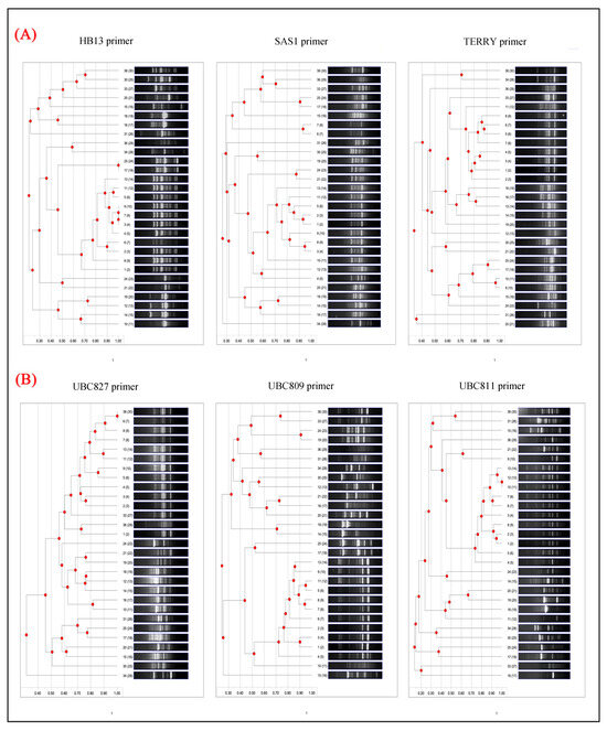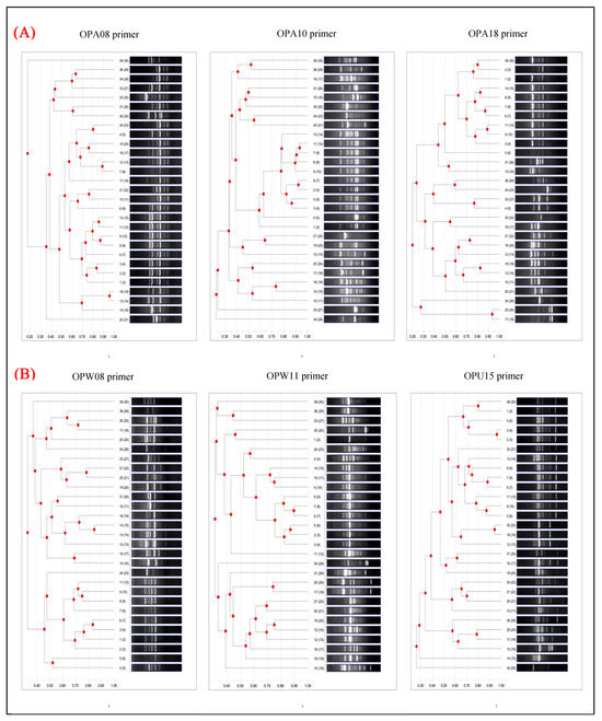 The dendrograms derived from the RAPD banding patterns of each primer illustrate the genetic relationships among the 29 bacterial isolates. Panel (A) depicts the OPA group characterized by a 70% purine content, whereas panel (B) displays other standardized primers with a purine content ranging from 50% to 60%.