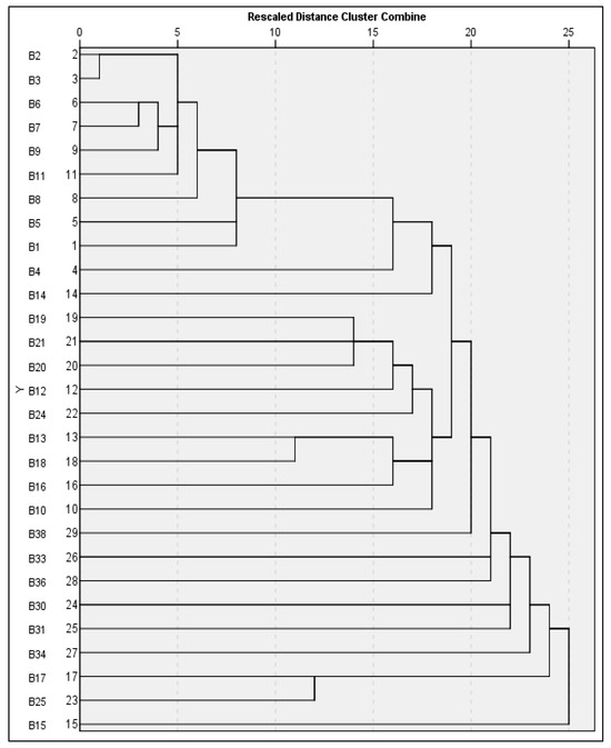 The hierarchical clustering of bacterial isolates, based on the aggregated RAPD data (Figure 7), elucidated distinct genetic assemblages, each indicative of varying levels of taxonomic similarity and evolutionary divergence. At the ultra-high similarity threshold (distance 0–5), a primary cluster was discerned, comprising isolates B2 and B3. Both strains are classified as Salmonella enterica subsp. enterica serovar Enteritidis and exhibit similarity coefficients exceeding 95%. This close proximity in clustering suggests they are likely clonal isolates originating from a common epidemiological source, corroborated by their nearly identical RAPD profiles across all six primers, signifying minimal polymorphism and a recent common ancestry. Extending into the high similarity range (distance 5–10), a secondary cluster emerged, incorporating isolates B6, B7, B9, B11, and B8. These strains represent a mix of Salmonella serovars, predominantly Enteritidis and Waycross, and constituted a coherent group. The clustering pattern signifies the presence of shared genetic elements, while still facilitating adequate resolution to distinguish individual strains. This implies they belong to related but genetically discernible lineages within the S. enterica species complex, providing valuable insights into intra-species evolutionary dynamics. In the moderate similarity range (distance 10–15), an intermediate cluster composed of B5, B1, B4, and B14 was observed. These strains include both Salmonella (Enteritidis and Minnesota serovars) and E. coli, representing members of the Enterobacteriaceae family. This grouping appears to bridge closely related Salmonella isolates and Escherichia species, demonstrating phylogenetic conservation at the family level while maintaining genus-specific divergence. The observed genetic distances reflect moderate evolutionary divergence and indicate shared ancestral traits across these Enterobacteriaceae taxa. As similarity decreases further (distance 15–20), a divergent cluster appears, consisting of B19, B21, B20, B12, and B24. This group displays significant taxonomic heterogeneity, including isolates of Escherichia, Citrobacter, Arthrobacter, and Salmonella Typhimurium. The broad genetic divergence within this group, evidenced by lower similarity coefficients, reflects distant phylogenetic relationships. The high discriminatory power of this clustering supports its application in epidemiological investigations and confirms the genetic distinctiveness of these strains. At the highest level of diversity (distance >20), a set of highly divergent strains forms a maximum diversity cluster, composed of 13 isolates. These include members of Bacillus, Enterobacter, and other diverse Enterobacteriaceae, and are characterized by extended branching and multiple singleton positions in the dendrogram. This pattern illustrates distant evolutionary relationships and highlights the ability of the RAPD approach to achieve maximal strain-level resolution across wide taxonomic distances.