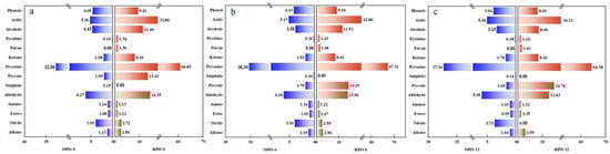 Variable importance in projection (VIP) analysis quantified each compound’s contribution to the PCA model [42]. Compounds with VIP values greater than 1 were identified as key volatile compounds (VOCs) that significantly contributed to the classification of peanut oils. As shown in Figure 4c, 24 VOCs (VIP > 1) are highlighted in red; these comprise five aldehydes, four alcohols, four ketones, one ester, two pyrazine heterocycles, one sulfur compound, two olefins, two alkanes, and three additional compounds. Changes in volatile levels led to differences in the flavor profiles of OPO and RPO samples.