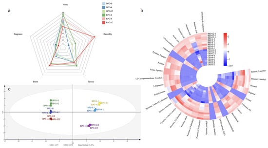 Flavor evaluation of OPO and RPO during storage period (a) sensory evaluation. (b) thermal map analysis of substances with ROAV > 1. (c) PCA.