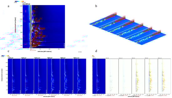 GC-IMS is highly responsive and sensitive for the detection of trace volatile compounds, making it particularly suitable for analyzing flavor substances in foods [27]. The volatile components of OPO and RPO were analyzed using GC-IMS, and changes in their volatile profiles over the storage period were identified (Figure 3). As shown in Figure 3a, 76 volatile compounds, including alcohols, aldehydes, ketones, alkenes, pyrazines, and esters, were detected in various OPO and RPO samples. In the IMS spectrum, the horizontal axis corresponds to the ion migration time (DT), and the vertical axis corresponds to the gas chromatographic retention time (RT). The complete spectrum represents the overall volatile profiles of each peanut oil sample. Notably, numerous signal peaks were observed in the RT range of 360–1200 s and DT range of 1.0–1.8, and a red hue in the spectrum indicated a higher signal intensity. The redder the color in the spectrum, the higher the volatility signal. Figure 3b presents the 3D IMS spectra of the OPO and RPO samples, from which it is evident that the signal intensities vary significantly at different baking temperatures. Similarly, Figure 3c displays the 2D IMS plots of the peanut oil samples, confirming that the volatile signal intensities differ greatly with baking temperature. Figure 3d compares the GC-IMS spectra of OPO and RPO, using OPO-0 as a reference. In this differential plot, white denotes a volatile content equal to that of OPO-0, blue indicates a lower content, and red indicates a higher content. Compared with OPO-0 (Figure 3d), the other OPO samples exhibited slight blue regions, suggesting only minor decreases in certain volatiles during the storage period. In contrast, the RPO samples displayed prominent red peaks relative to the OPO samples, indicating that RPO contains higher concentrations of flavor compounds.