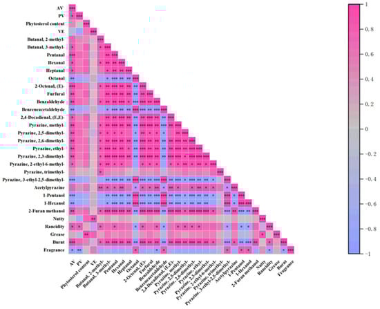 To further investigate the relationships between flavor compounds and both physicochemical properties and sensory attributes, we performed a Spearman correlation analysis on flavor compounds with an odor activity value (ROAV) > 1 (including pyrazines, alcohols, and aldehydes) and the acid value (AV), peroxide value (PV), vitamin E (VE), sterol content, and sensory scores of the samples (Figure 5). The results revealed that the key markers of lipid oxidation, hexanal, heptanal, 2-octenal, and 2,4-decadienal, which contribute to grassy, fatty, and oily off-odors [50], increased significantly with elevated AV and PV. These compounds exhibited strong negative correlations with sensory scores, indicating their major role in reducing oil acceptability. Additionally, they were strongly negatively correlated with VE content, suggesting that VE effectively inhibits lipid oxidation and thus prevents the formation of these undesirable flavor compounds. In contrast, certain pyrazines, such as methylpyrazine, 2,5-dimethylpyrazine, and trimethylpyrazine, which impart pleasant nutty, roasted, and toasted aromas, are considered core contributors to high-quality oil flavors [51]. These pyrazines exhibited strong positive correlations with sensory scores and negative correlations with AV and PV, implying that they may degrade or react with oxidation products during lipid oxidation. Other aldehydes, such as benzaldehyde (which provides a nut-like aroma [52]), can contribute positively to the flavor at appropriate concentrations. Additionally, short-chain fatty acids such as acetic acid (vinegary) and hexanoic acid (sweaty) significantly lowered the sensory scores. Therefore, in oil quality control during storage, in addition to monitoring AV and PV, it is advisable to prioritize the detection of aldehydes, such as hexanal, and characteristic pyrazines, such as trimethylpyrazine. These compounds can serve as direct and sensitive indicators of changes in oil flavor quality.