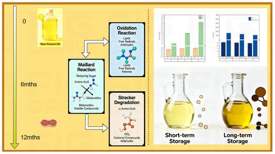 One kilogram of peanut seeds was divided into two batches and roasted at 140 °C and 160 °C for 30 min using a continuous circular monolayer roasting machine (Jiangsu Maisi Machinery Equipment Co., Ltd., Suzhou, China). The obtained oils were immediately bottled in 100 mL clear glass bottles and stored at ambient temperature (approximately 25 °C) under normal laboratory lighting conditions for the duration of the study. The roasted seeds were then pressed at room temperature using a Westinghouse (Pittsburgh, PA, USA) to obtain peanut oils, which were labeled OPO (from the 140 °C roast) and RPO (from the 160 °C roast). The obtained oils were immediately bottled and stored at ambient temperature. The oils were bottled in 250 mL clear glass bottles and stored at ambient temperature (approximately 25 °C) under normal laboratory lighting conditions, simulating a typical shelf storage environment. Samples were collected at 0, 6, and 12 months of storage and designated OPO-0, RPO-0, OPO-6, RPO-6, OPO-12, and RPO-12 for subsequent analyses.
