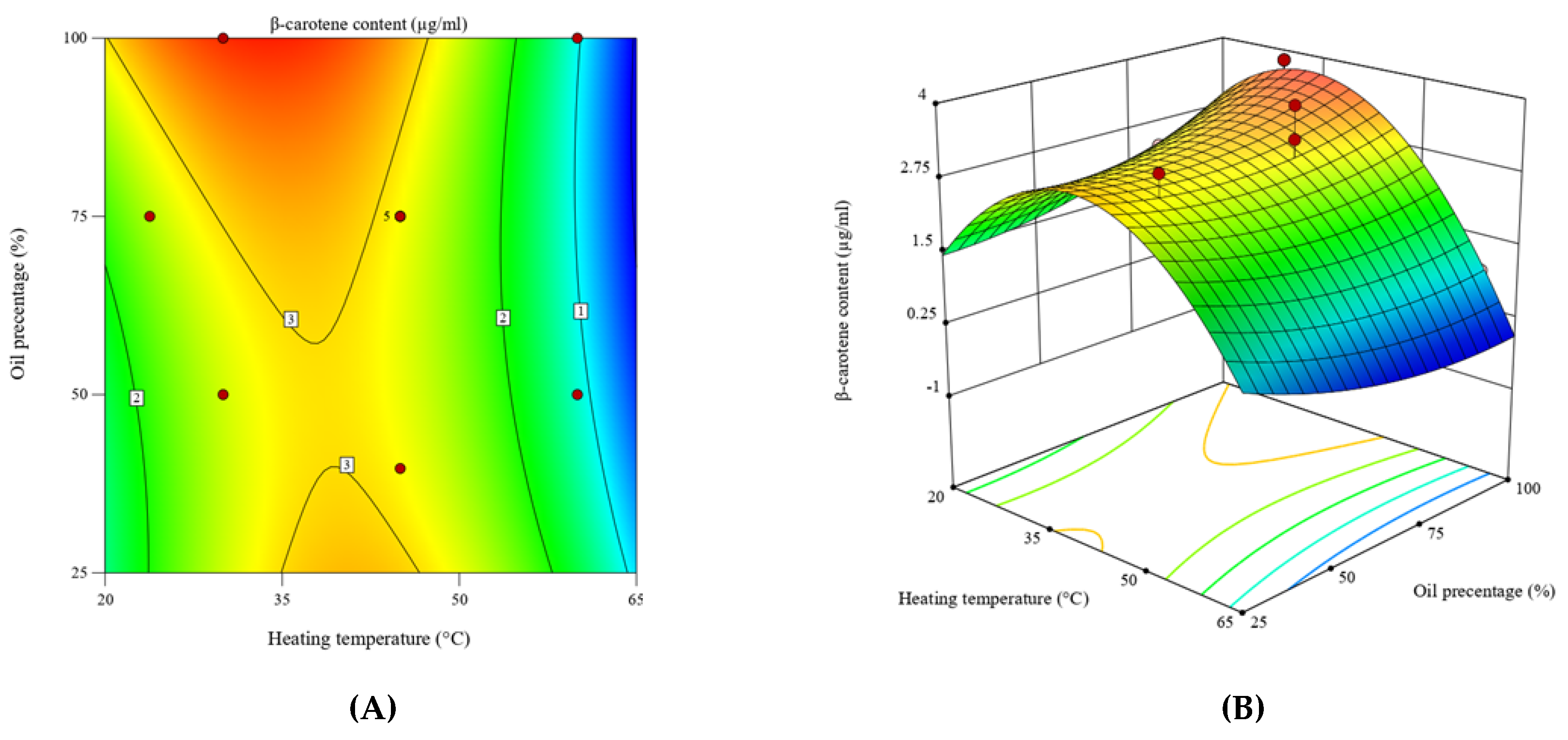 | Factor 1 Heating Temperature (°C) | Factor 2 Oil Percentage (%) | β-Carotene Content (µg/mL) | ||