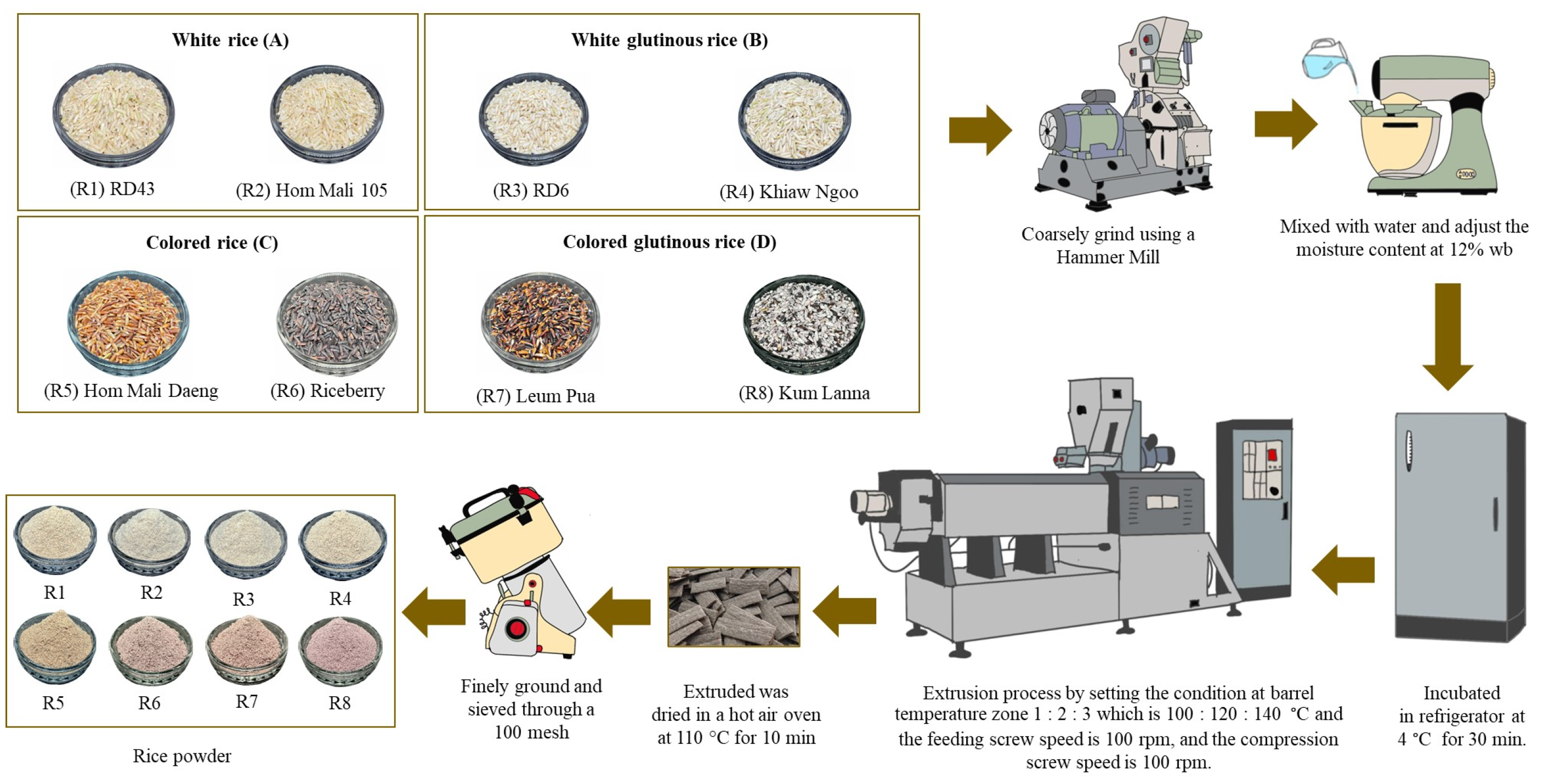 Rice (Oryza sativa) is one of the most crucial crops for social stability and food security [1]. Asia, Sub-Saharan Africa, and South America are the major regions for rice cultivation. The amount of rice consumed tends to increase rapidly and this could be the result of faster population expansion both urbanization and shifting consumer demands [2]. Each rice strain has various characteristics that are similar or different, including color, size, shape, and appearance. Pigments, such as anthocyanins, are important components that give rice its characteristics, including black, red, and purple colors. Anthocyanins are polyphenols that belong to the flavonoid group. It has nutraceutical properties, antioxidant activity, aids in blood circulation, and slows the aging process. Flavonoids have antioxidant properties. They can protect the body from damage caused by free radicals. High levels of free radicals can lead to oxidative stress, which accelerates disease and the aging process. Flavonoids inhibit cell and deoxyribonucleic acid (DNA) damage caused by free radicals, thus helping to slow aging [3]. Currently, rice is processed into various forms, including rice powder, pre-cooked rice flours, or instant powdered beverage products, which are also interesting products for consumers. This liquid food product is particularly beneficial for individuals experiencing difficulties with mastication, as it allows for effortless swallowing. Consumption of pre-cooked rice flours takes 3–5 min for preparation, but producing normal rice porridge takes an average of 30–60 min [4]. It is easily digested, suitable for the elderly and patients who require easily digestible food, and is an alternative product for consumers who are allergic to wheat gluten. Pre-cooked rice flour or instant powdered beverage is a product obtained by washing rice thoroughly, followed by baking or partial cooking. It is ground into powder that may be flavored with sugar, salt, and other ingredients such as milk and powdered or ground grains before consumption by adding hot water and stirring well [5]. There are many factors that affect the properties of instant pre-cooked rice flours, including the growing environment (temperature and soil conditions), processing method, and chemical composition, especially the proportion of amylose and amylopectin. This affects the physicochemical properties of rice flour and the texture of the final product. The good characteristics of the pre-cooked rice flour must be flaking or powder, dry, not clumped, free from undesirable flavors, natural color, and scent [6].