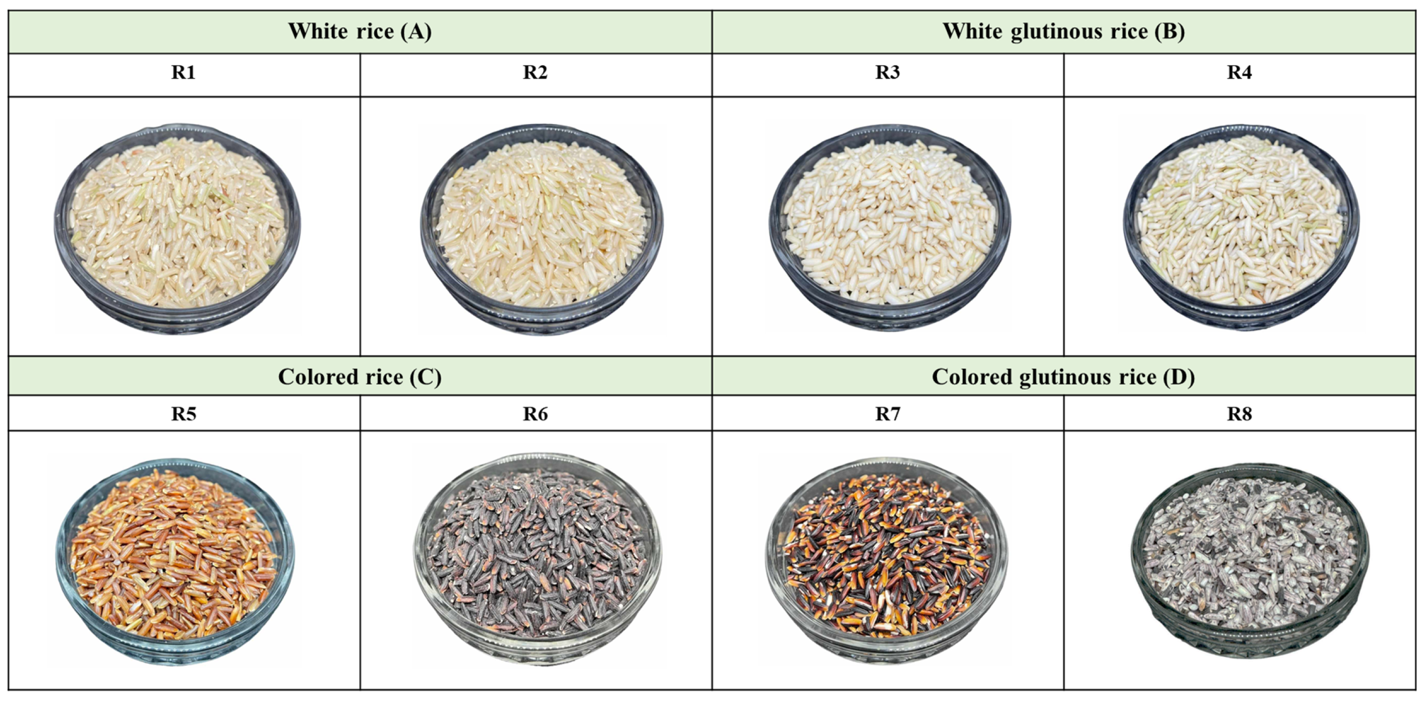 Figure 3. Raw rice powder samples including (R1) RD43, (R2) Hom Mali 105, (R3) RD6, (R4) Khiaw Ngoo, (R5) Hom Mali Daeng, (R6) Riceberry, (R7) Leum Pua, and (R8) Kum Lanna.
