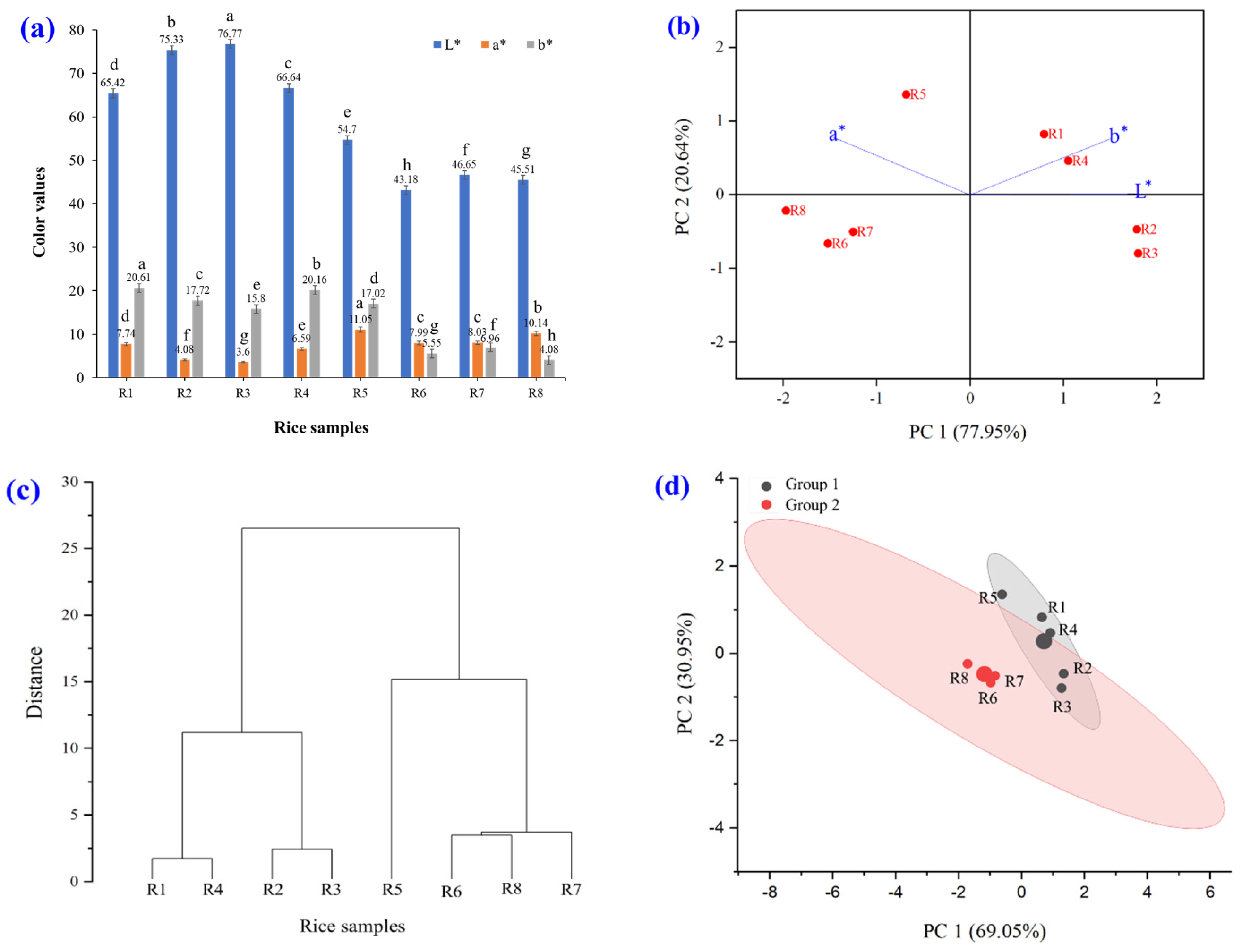 Figure 4. Color characteristics of raw rice powder samples including (R1) RD43, (R2) Hom Mali 105, (R3) RD6, (R4) Khiaw Ngoo, (R5) Hom Mali Daeng, (R6) Riceberry, (R7) Leum Pua, and (R8) Kum Lanna; (a) color value; (b) principal component analysis (PCA) biplot; (c) hierarchical cluster analysis and (d) PCA and k-means cluster analysis of rice color.