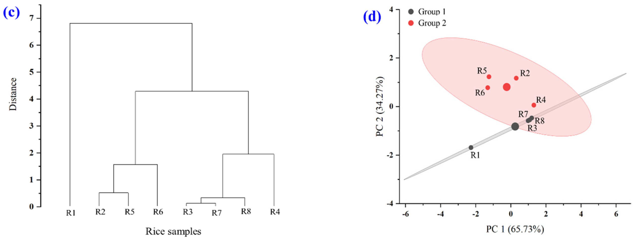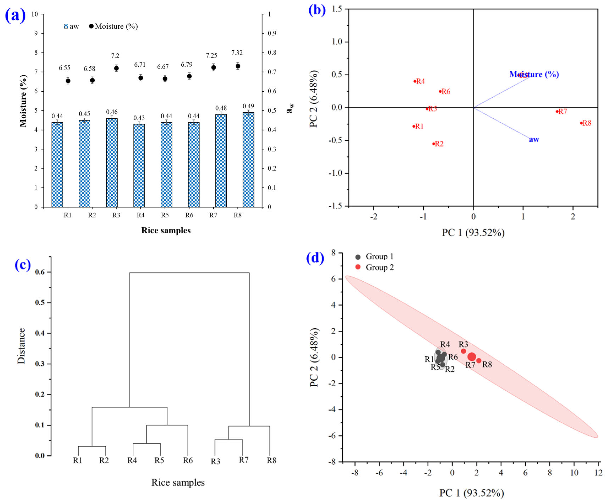 Figure 5. Moisture and aw characteristics of raw rice powder samples including (R1) RD43, (R2) Hom Mali 105, (R3) RD6, (R4) Khiaw Ngoo, (R5) Hom Mali Daeng, (R6) Riceberry, (R7) Leum Pua, and (R8) Kum Lanna; (a) moisture and aw value; (b) principal component analysis (PCA) biplot; (c) hierarchical cluster analysis and (d) PCA and k-means cluster analysis of moisture and aw.