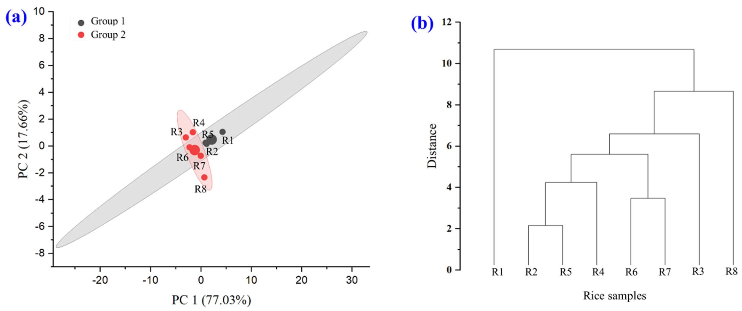 Figure 6. Aroma characteristics of raw rice powder samples including (R1) RD43, (R2) Hom Mali 105, (R3) RD6, (R4) Khiaw Ngoo, (R5) Hom Mali Daeng, (R6) Riceberry, (R7) Leum Pua, and (R8) Kum Lanna; (a) PCA and k-means cluster analysis of aroma value and (b) hierarchical cluster analysis.