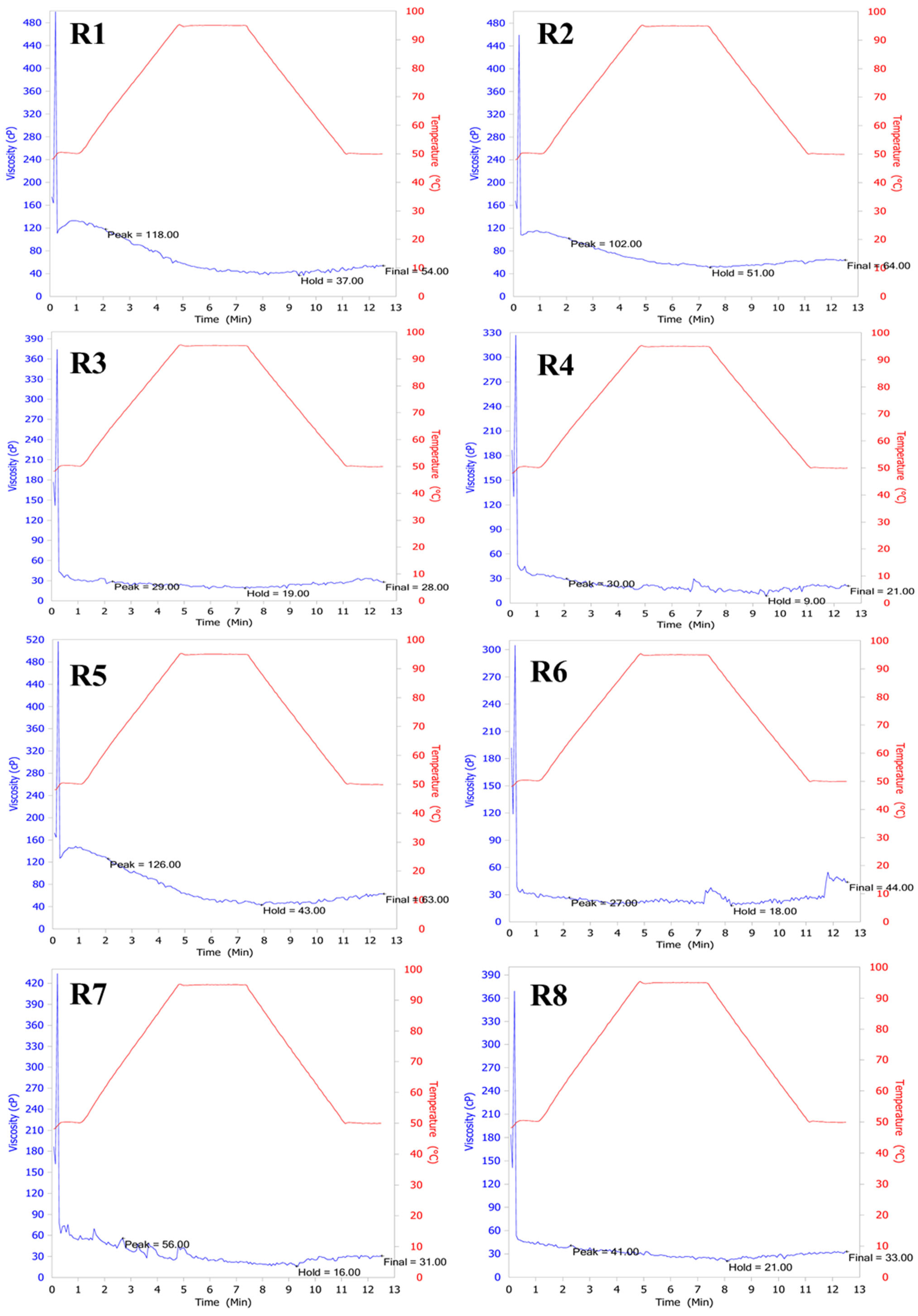 Figure 8. Viscosity measurement using a Rapid Visco Analyzer of raw rice powder samples including (R1) RD43, (R2) Hom Mali 105, (R3) RD6, (R4) Khiaw Ngoo, (R5) Hom Mali Daeng, (R6) Riceberry, (R7) Leum Pua, and (R8) Kum Lanna.
