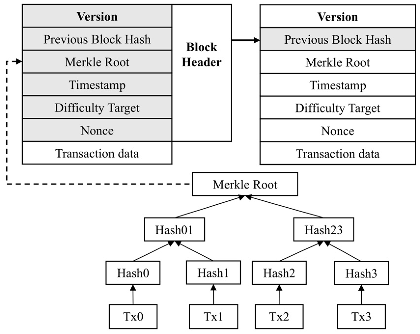 Blockchain structure diagram. (Arrows indicate the flow of data from the block header to the Merkle root and the connection between hash nodes and transaction data).