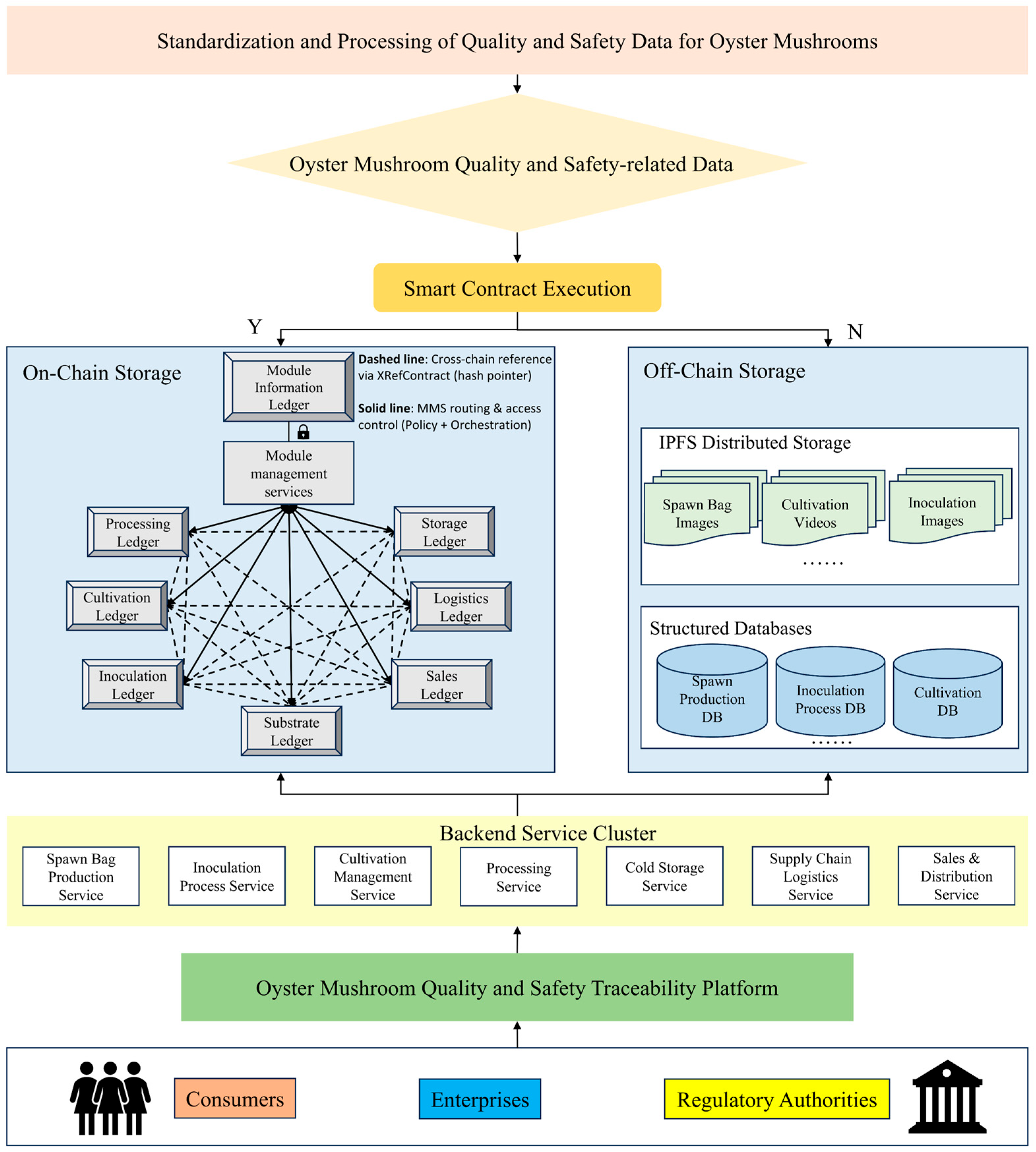 Pleurotus ostreatus, a highly perishable product with strong dependence on environmental conditions. Current systems largely rely on IoT-based environmental monitoring but lack trustworthy data storage and flexible traceability mechanisms, making it difficult to address the differentiated needs across various supply chain stages. In addition, traceability information from multiple stakeholders is often stored within a single blockchain ledger, which limits the system’s ability to meet heterogeneous requirements [