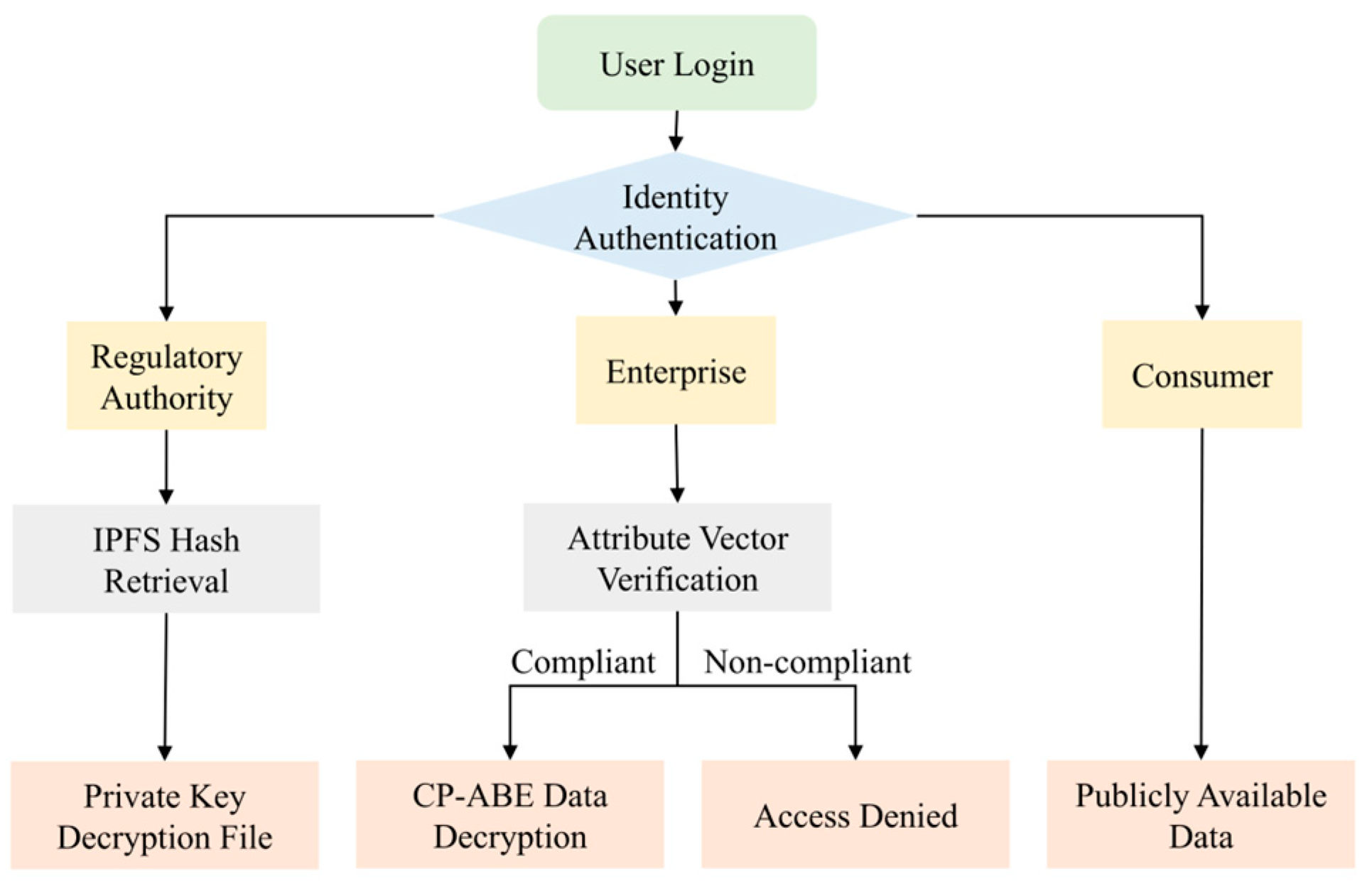 A three-layer access control model—comprising public, private, and regulatory domains—is established. By integrating Ciphertext-Policy Attribute-Based Encryption (CP-ABE) with customized smart contracts, the system enables secure and precise data sharing among producers, regulators, and consumers, thereby supporting the trustworthy circulation of Pleurotus ostreatus safety information.
